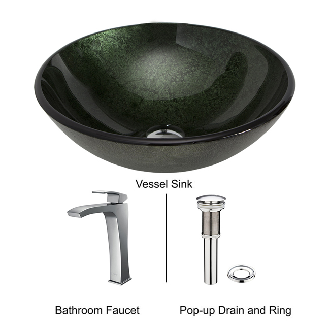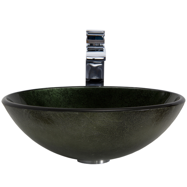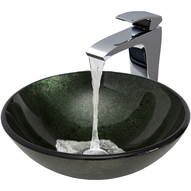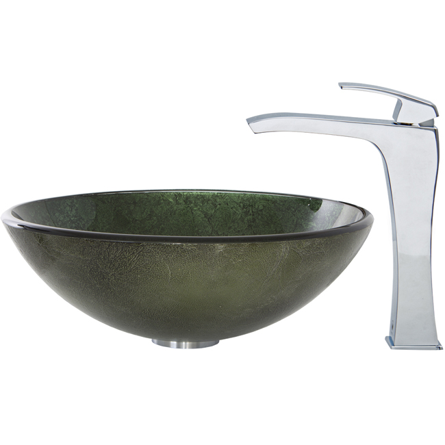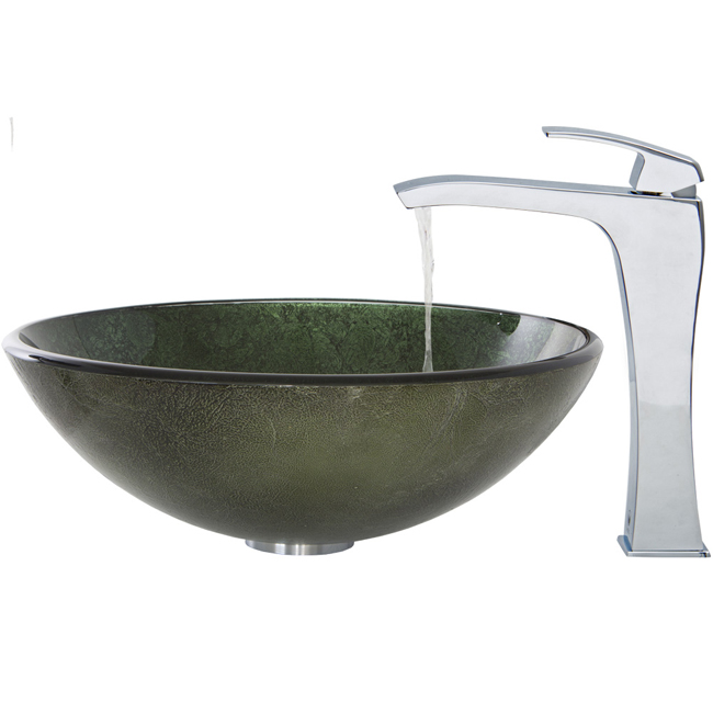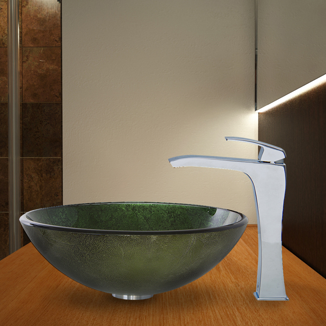 The VIGO Emerald glass vessel sink and Blackstonian faucet set in Chrome add style and bold color to your bathroom.