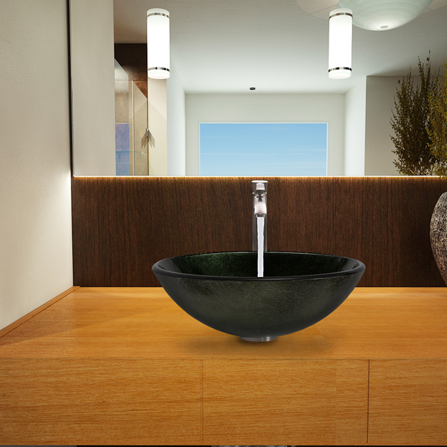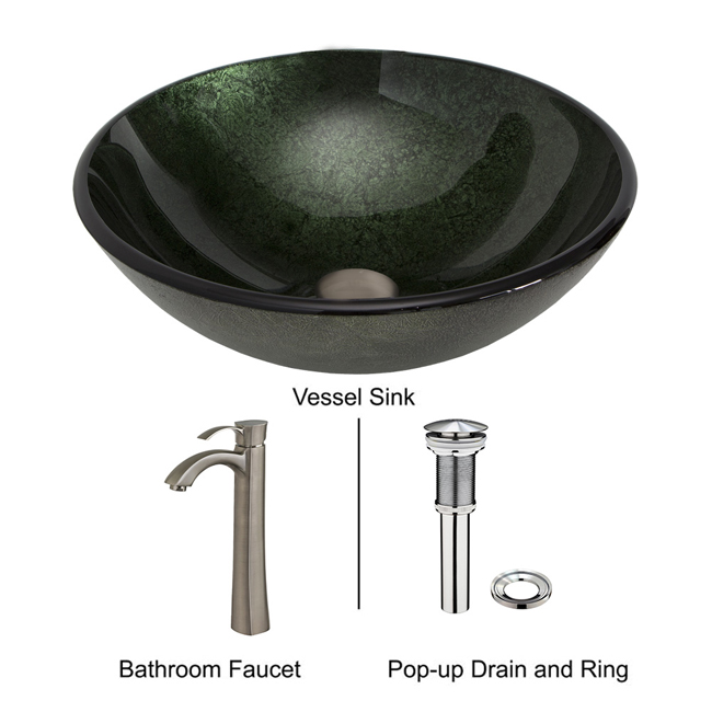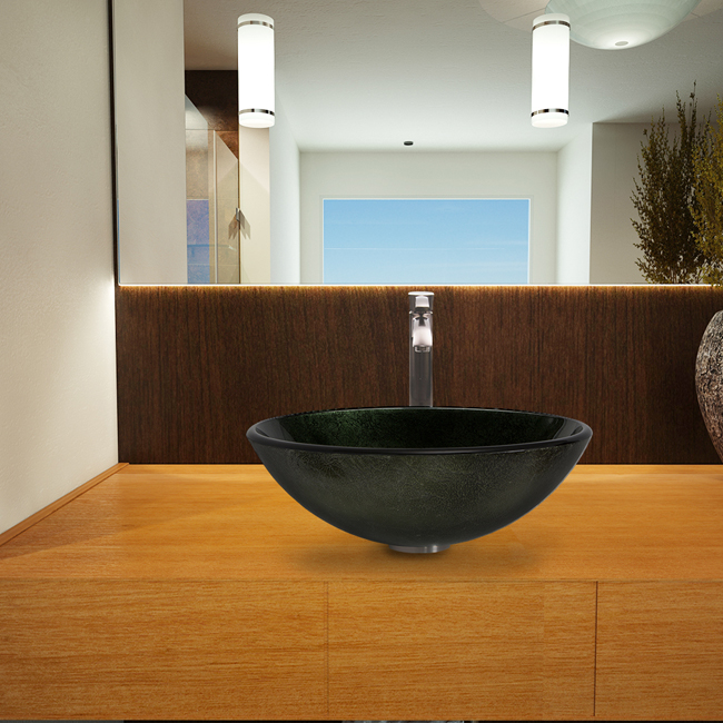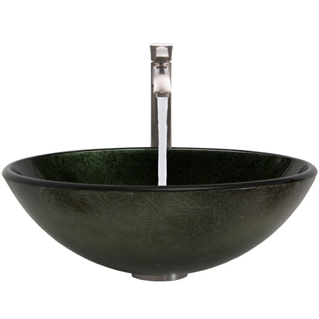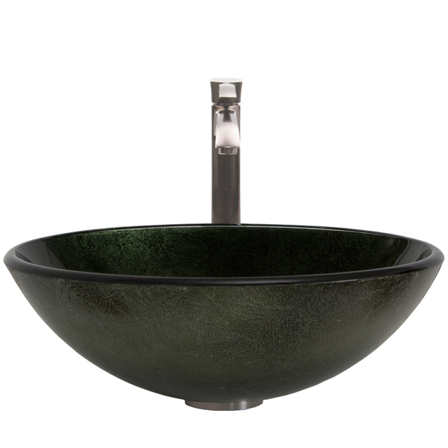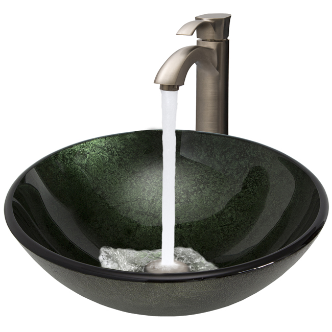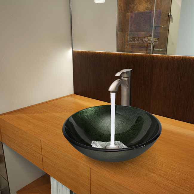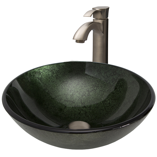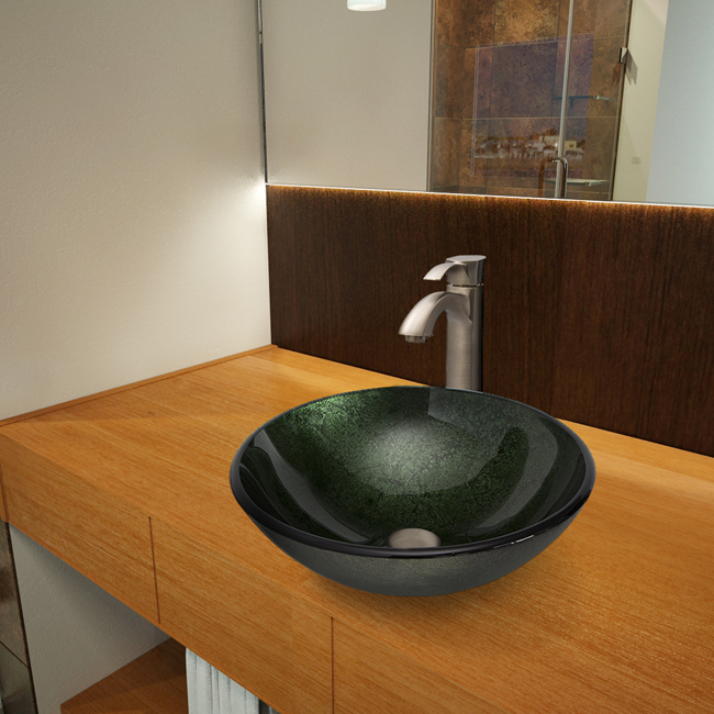 The VIGO Emerald glass vessel sink and Otis faucet set in Brushed Nickel is a contemporary addition for your bathroom.