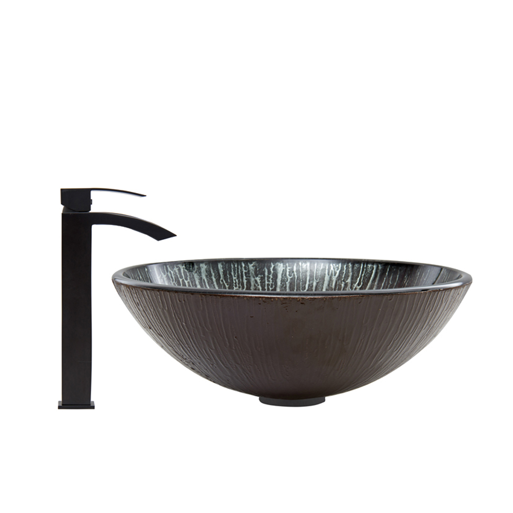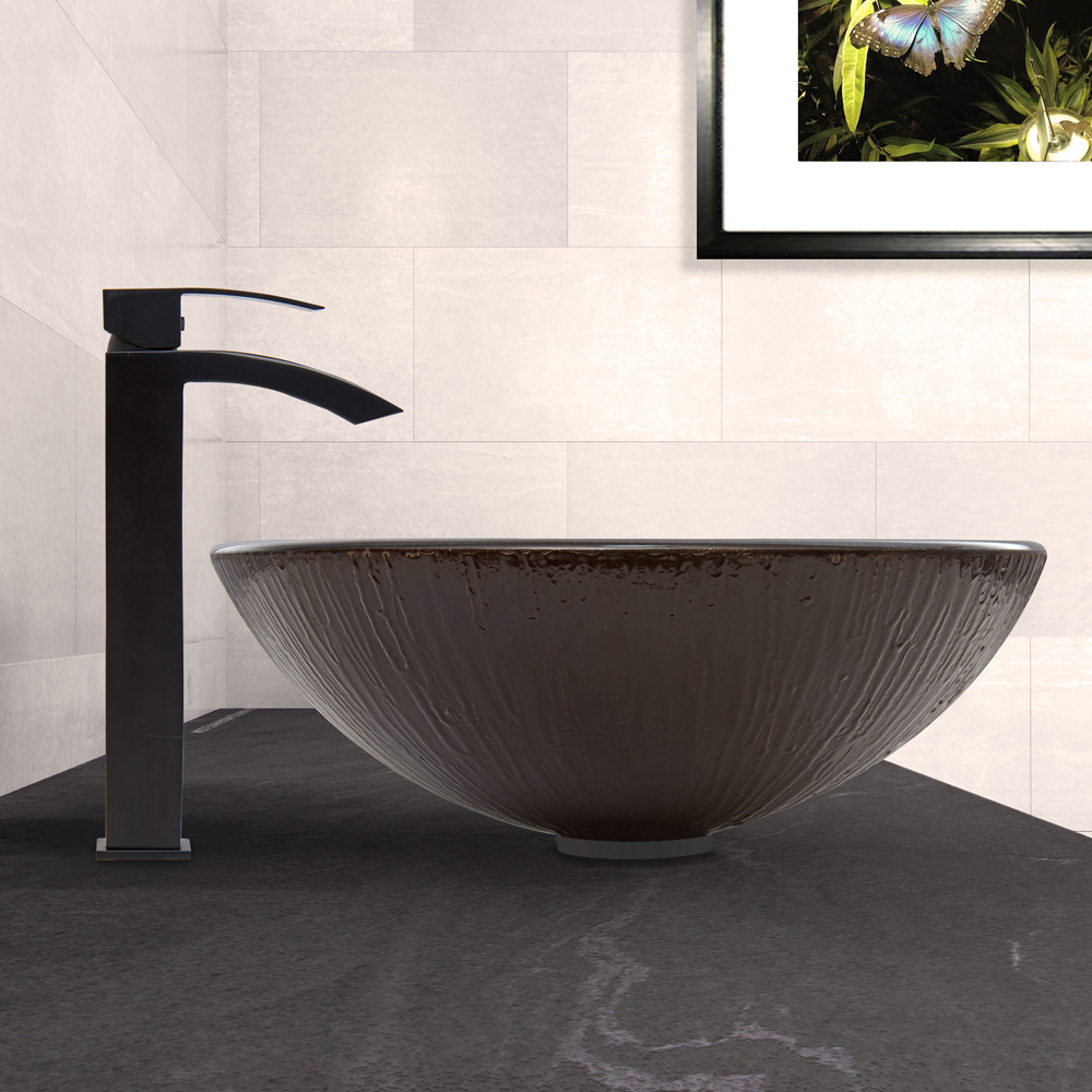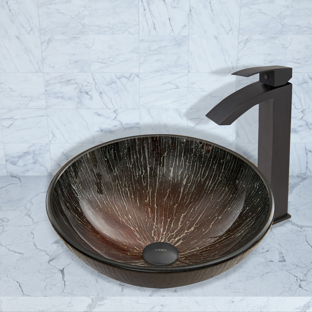 The VIGO Enchanted Earth Glass Vessel Sink and Duris Faucet Set in Matte Black Finish is a charming addition to a delightful bathroom.