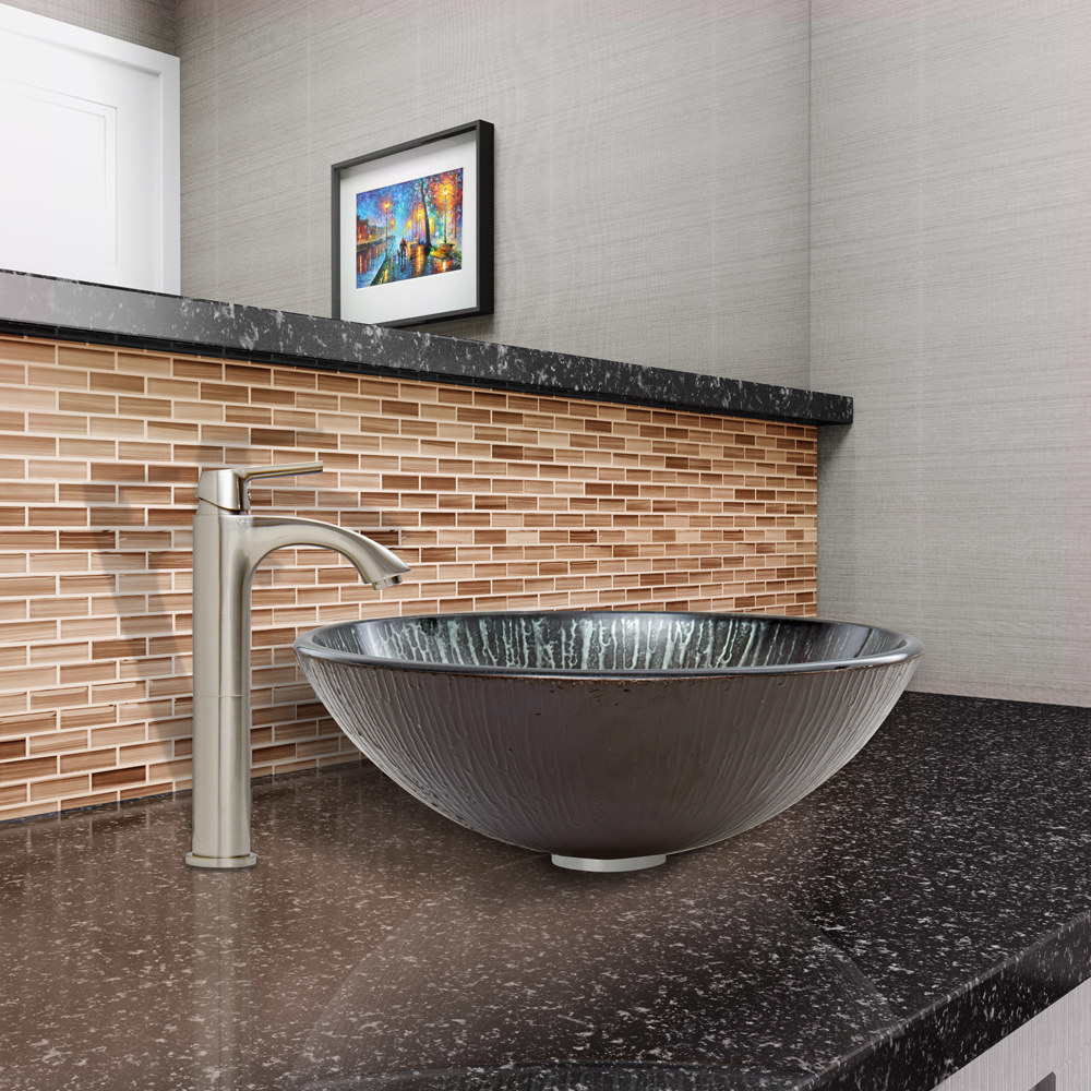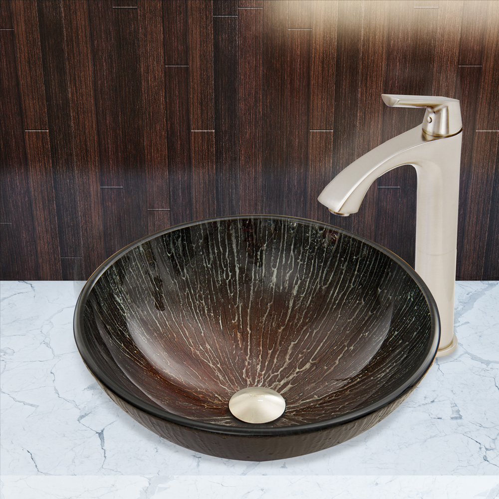 The VIGO Enchanted Earth Glass Vessel Sink and Linus Faucet Set in Brushed Nickel Finish is a charming addition to a delightful bathroom.
