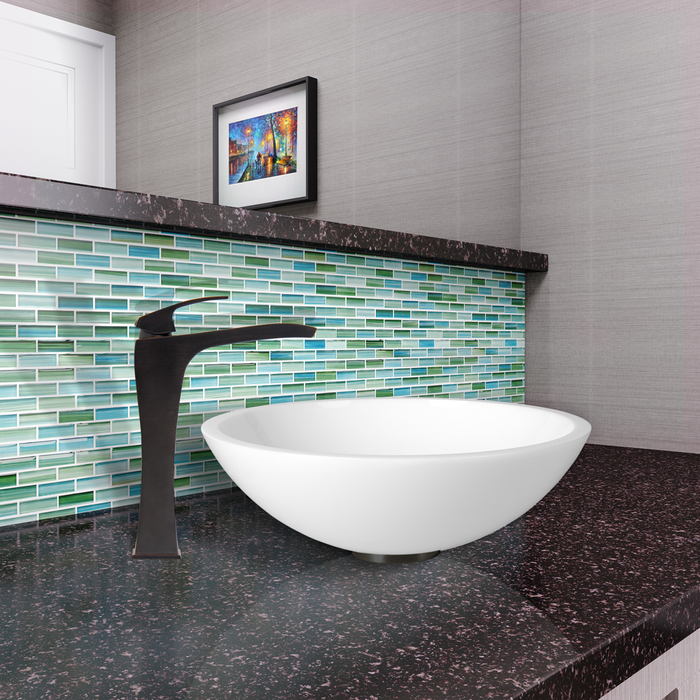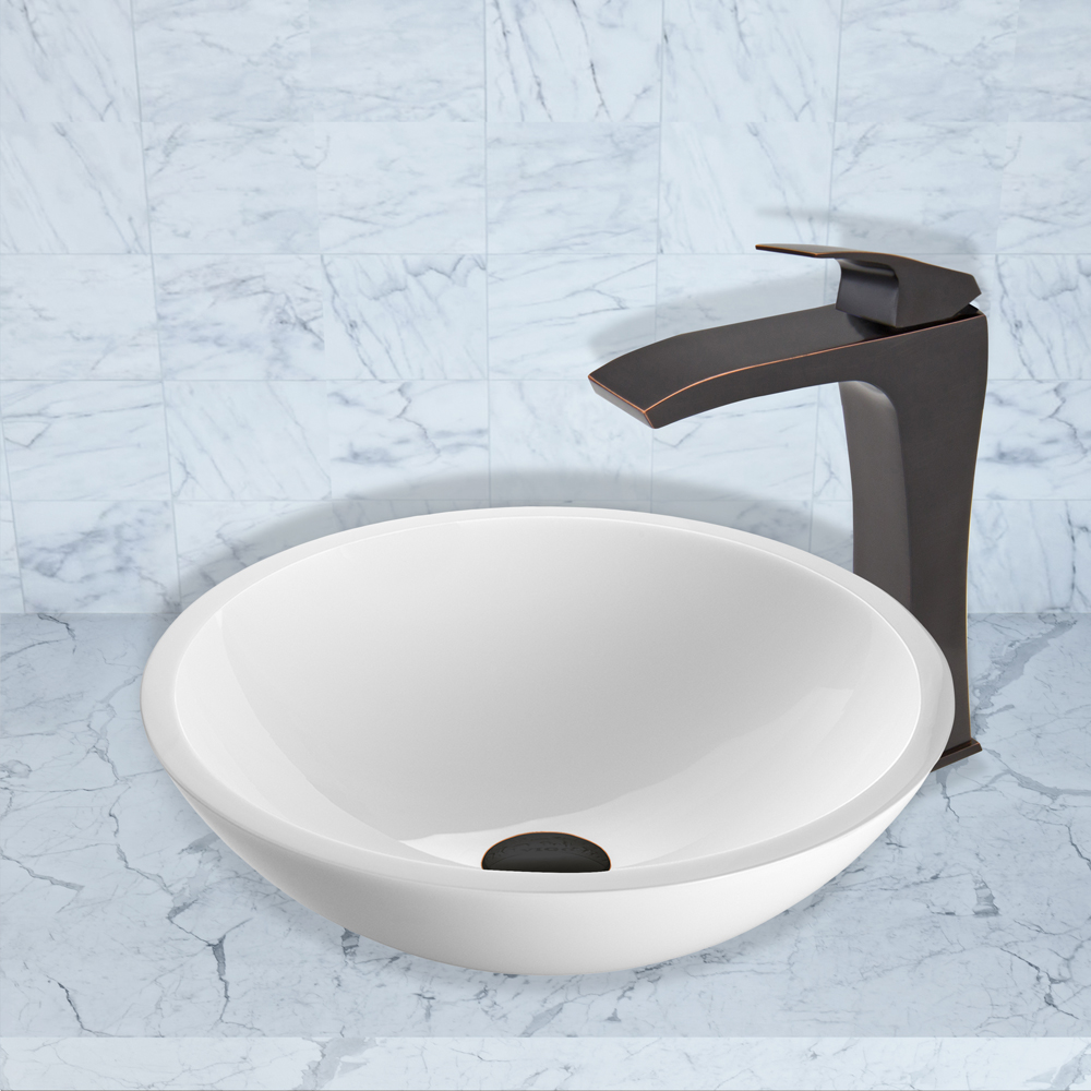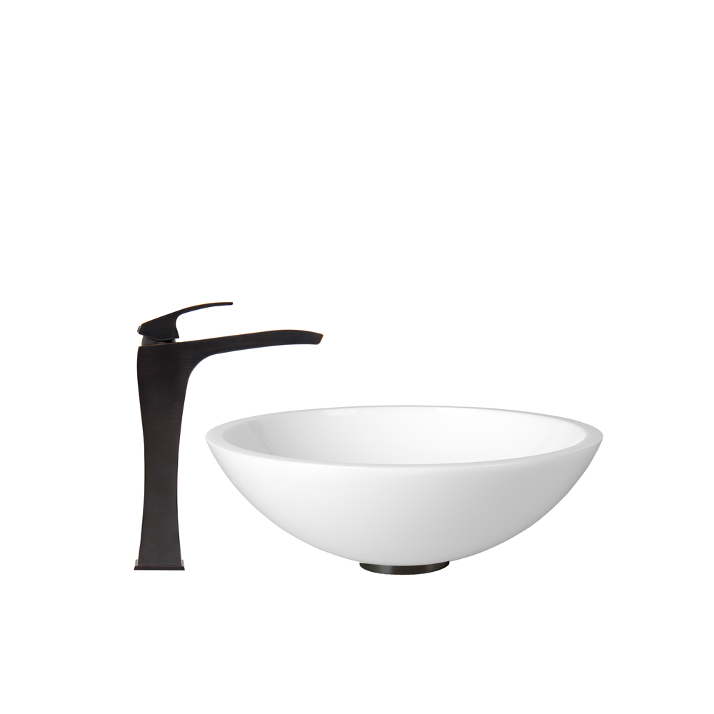 The VIGO Flat Edged White Phoenix Stone Glass Vessel Sink and Blackstonian Faucet Set in Antique Rubbed Bronze Finish creates the perfect match for your bathroom.