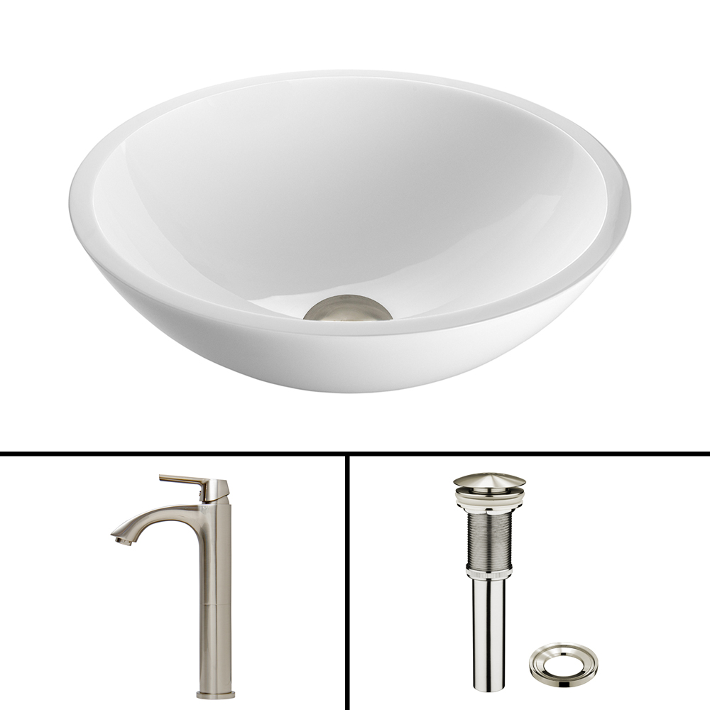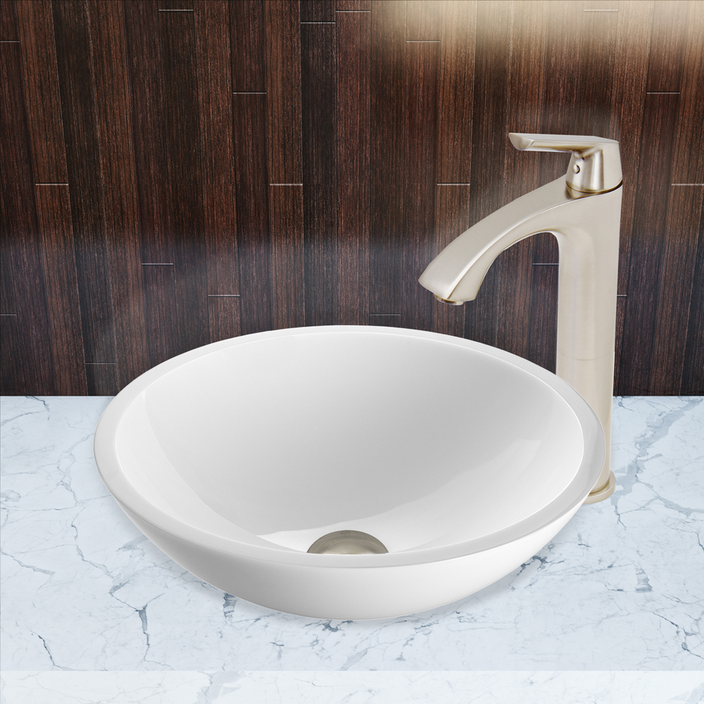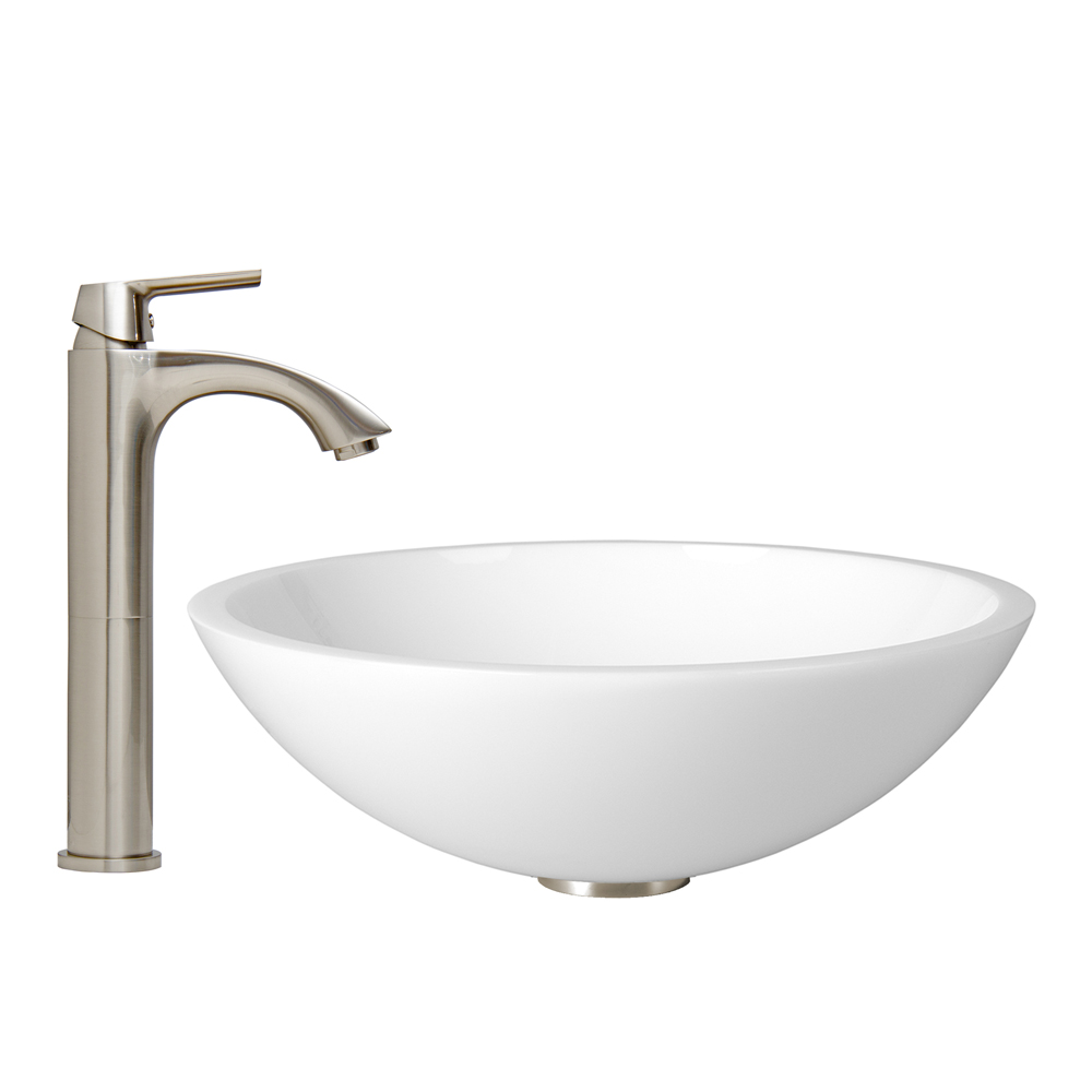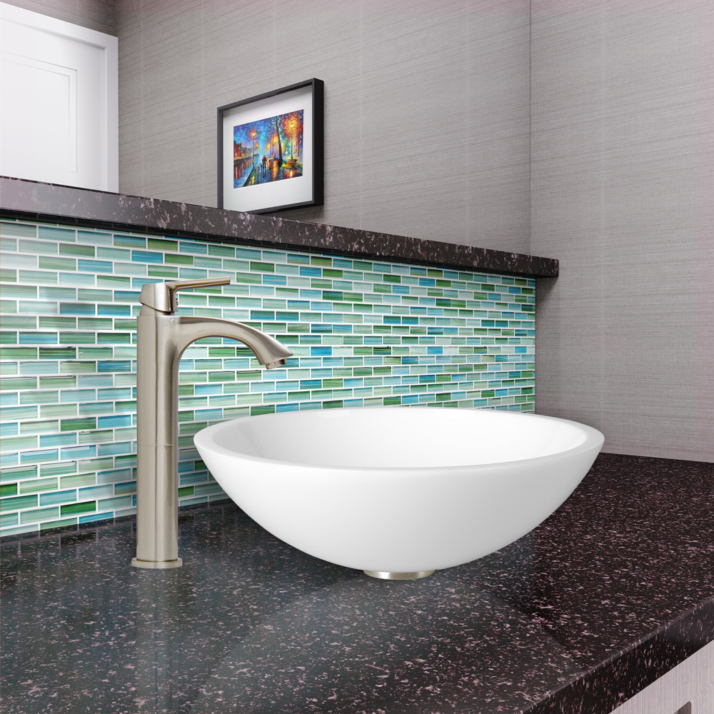 The VIGO Flat Edged White Phoenix Stone Glass Vessel Sink and Linus Faucet Set in Brushed Nickel Finish creates the perfect match for your bathroom.