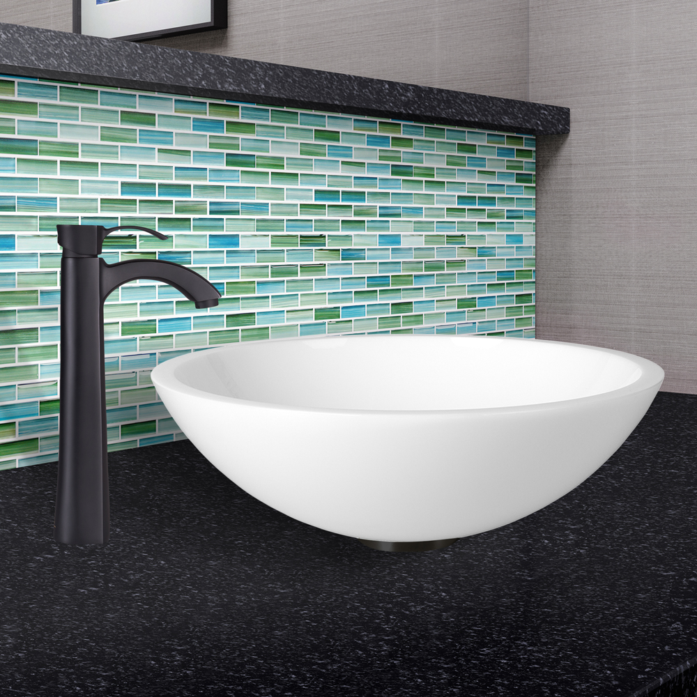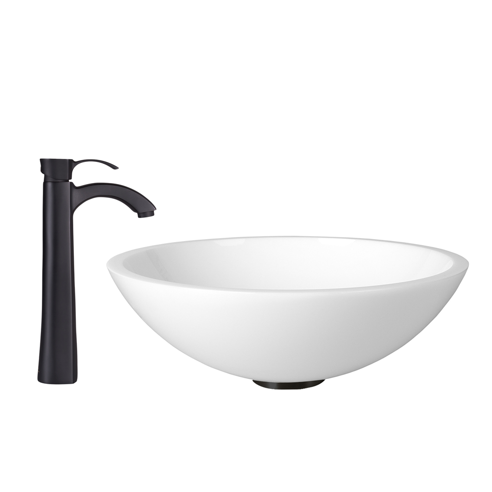 The VIGO Flat Edged White Phoenix Stone Glass Vessel Sink and Otis Faucet Set in Matte Black Finish creates the perfect match for your bathroom.