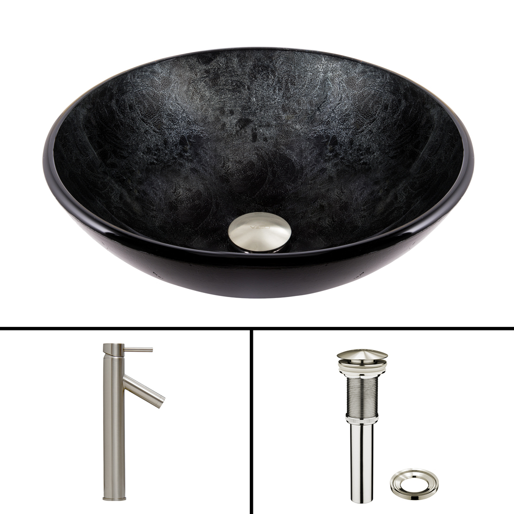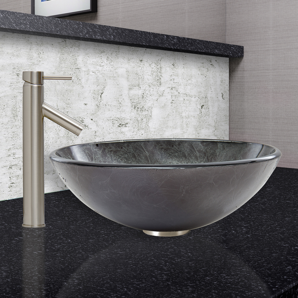 The VIGO Gray Onyx Glass Vessel Sink and Dior Faucet Set in Brushed Nickel Finish provides any bathroom with a unique and distinctive style.