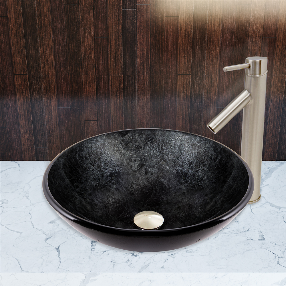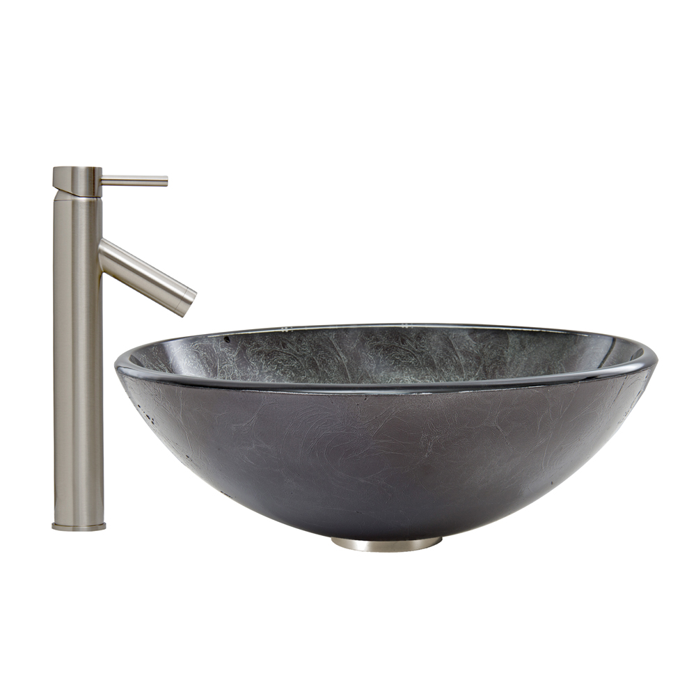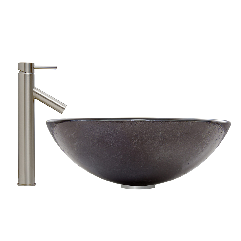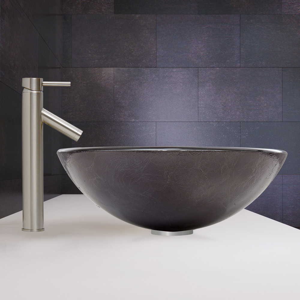 The VG07051 Gray Onyx glass vessel bowl features a graceful and shimmering fusion of black and silver colors.