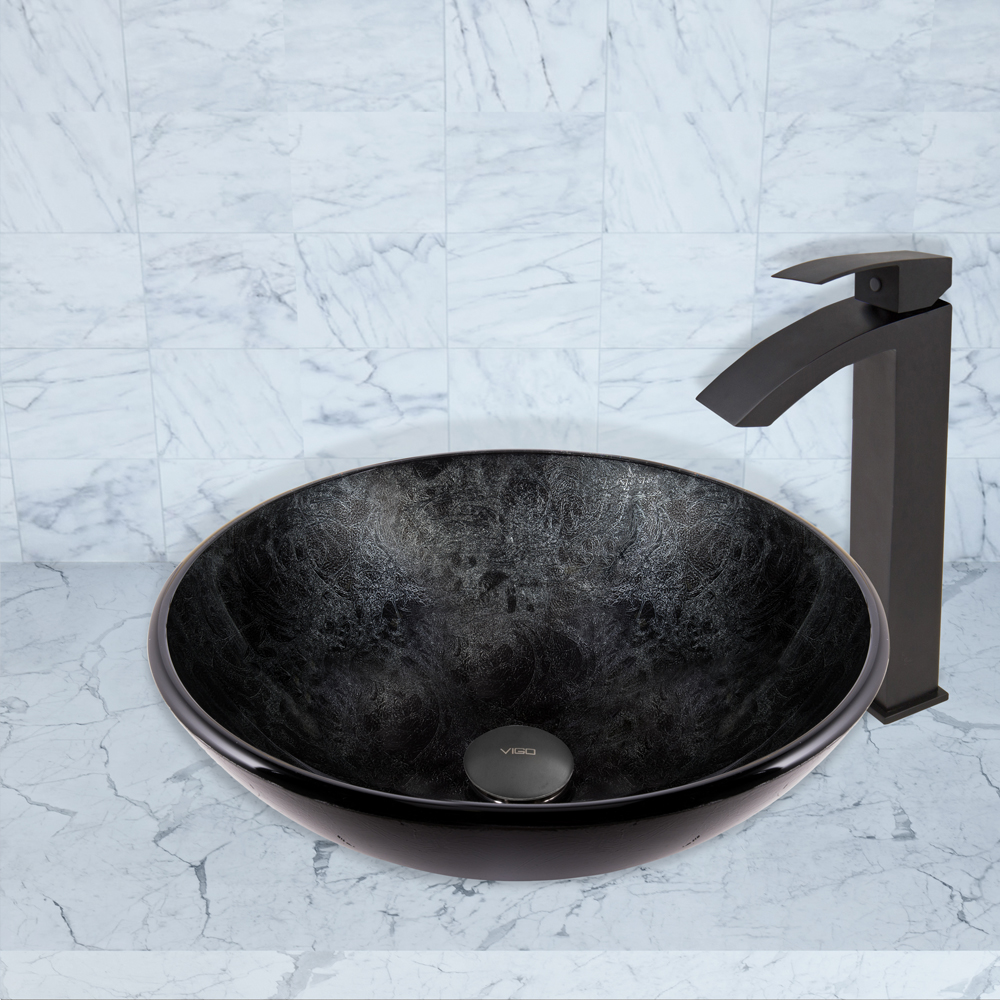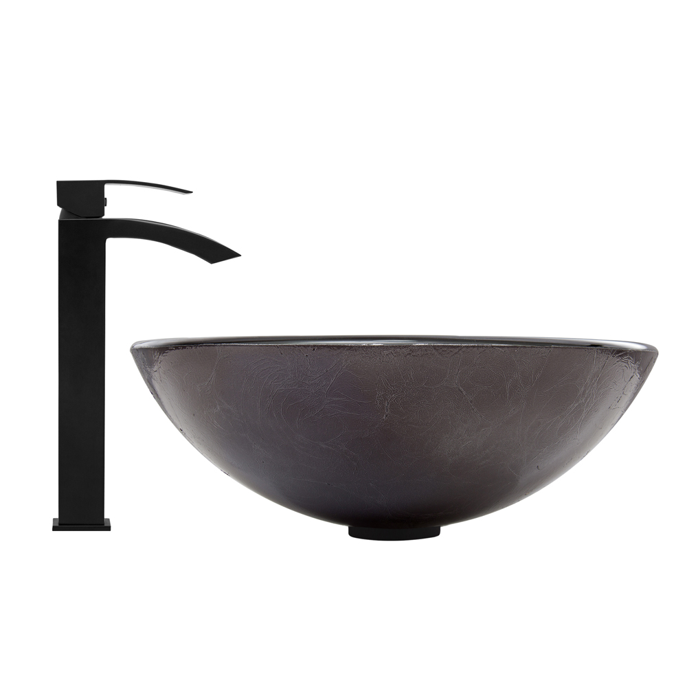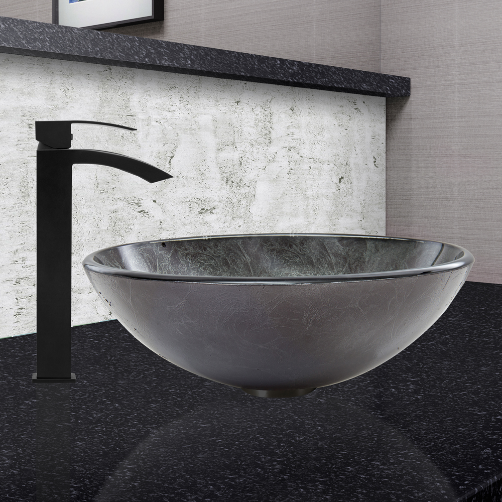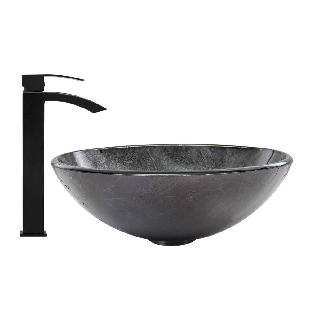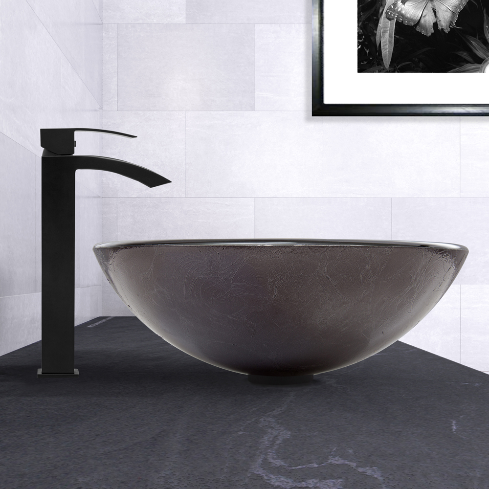 The VG07051 Gray Onyx glass vessel bowl features a graceful and shimmering fusion of black and silver colors.