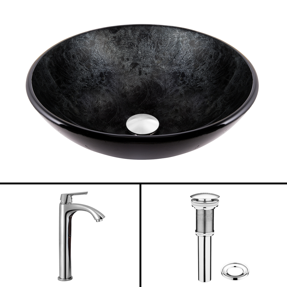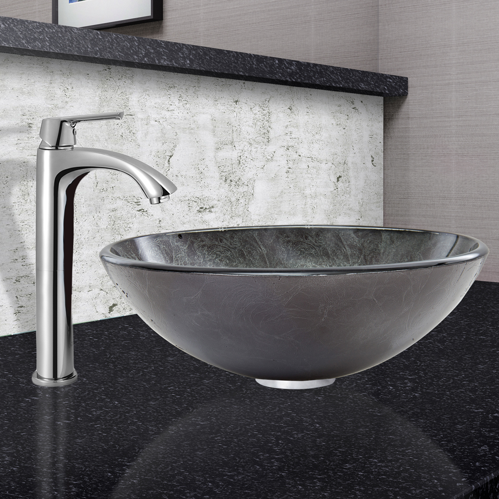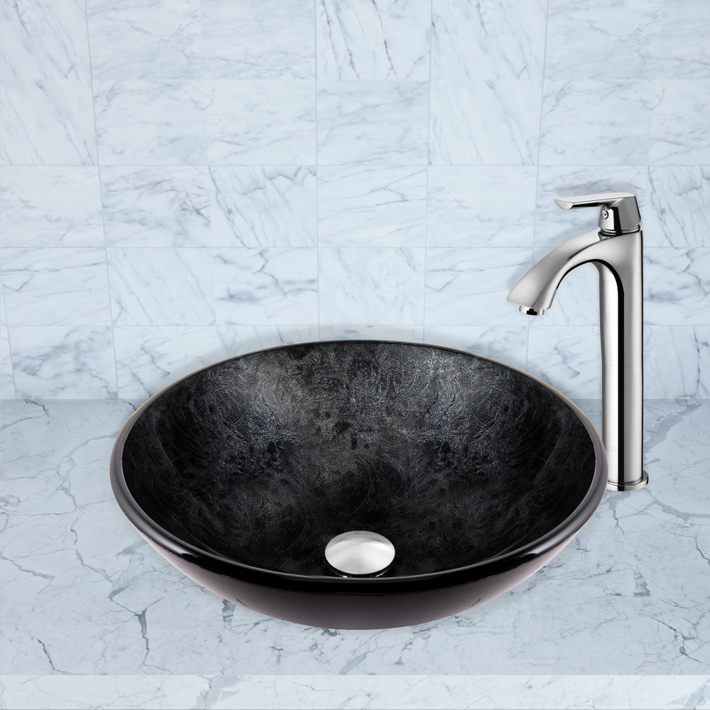 The VG07051 Gray Onyx glass vessel sink features a graceful and shimmering fusion of black and silver colors.