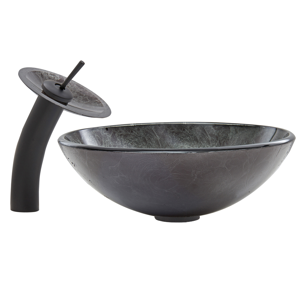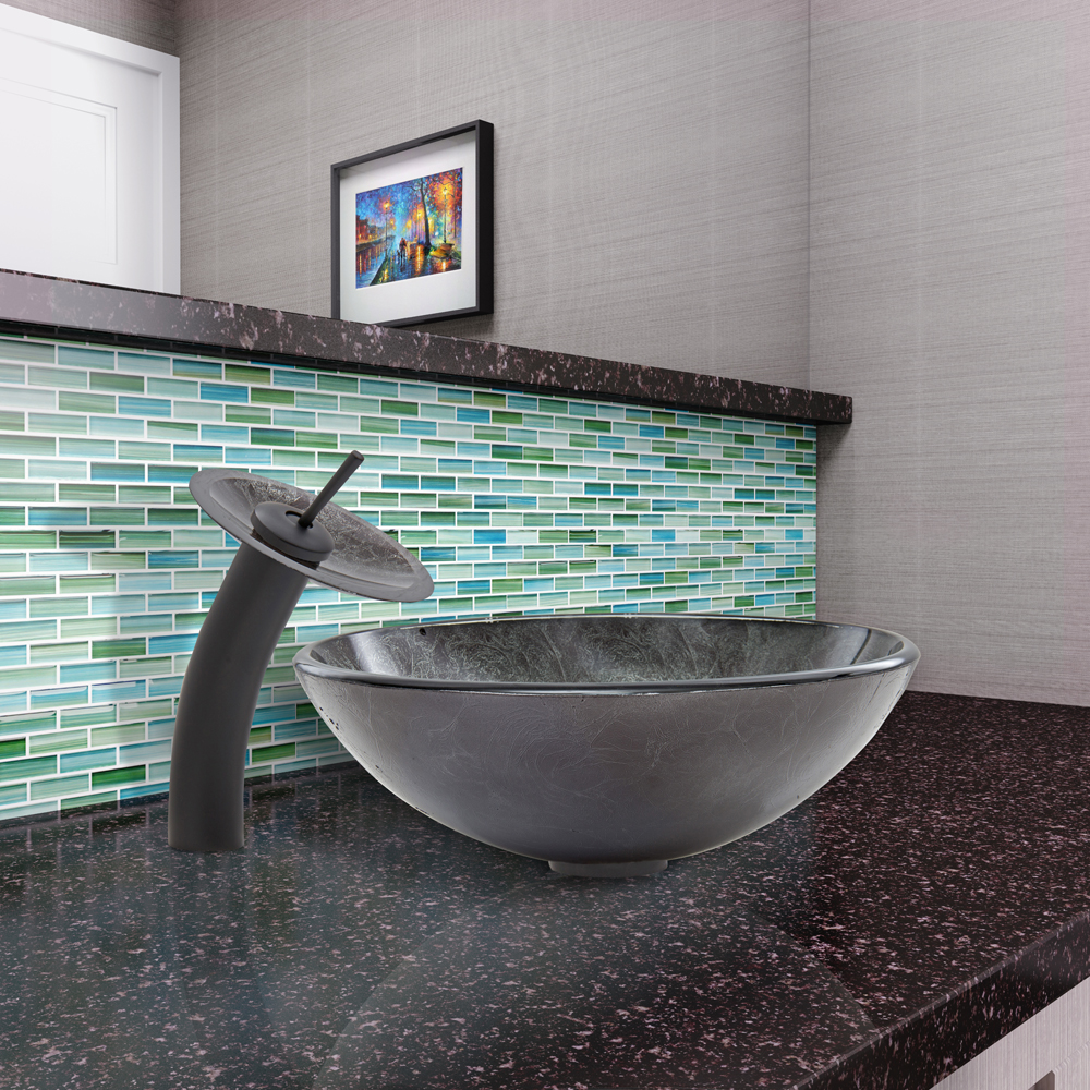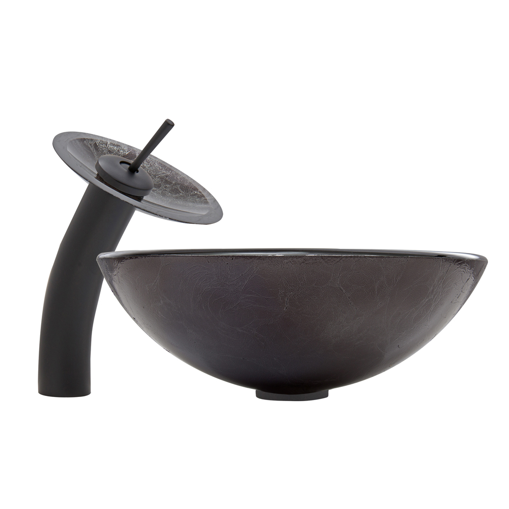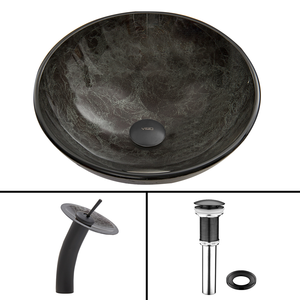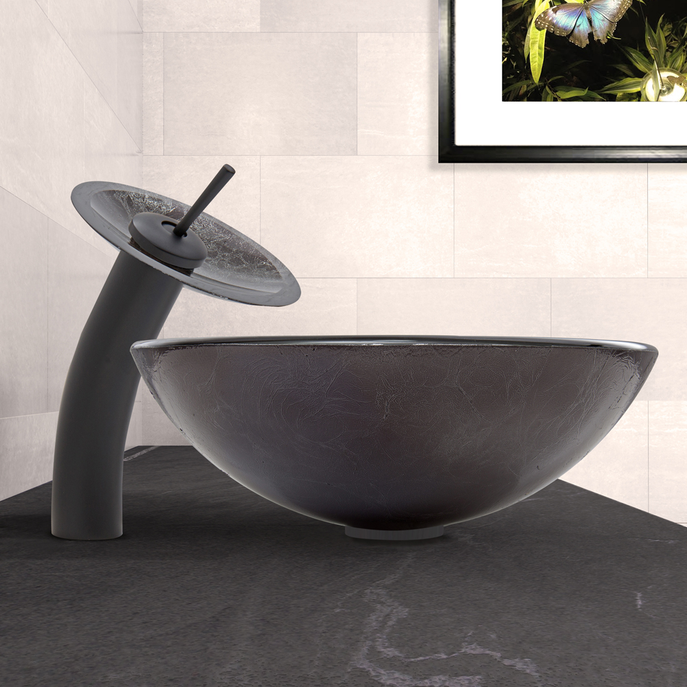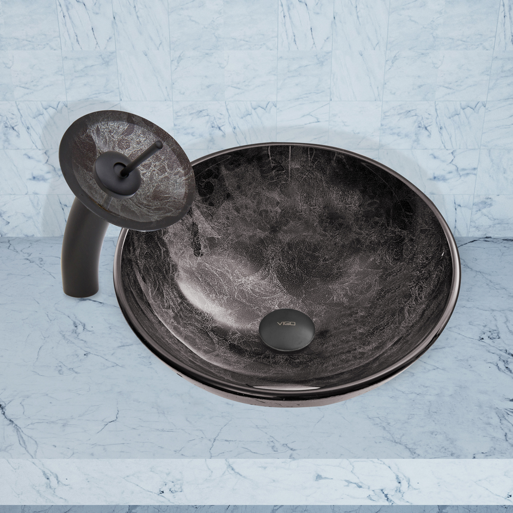 The VIGO Gray Onyx vessel sink and matching waterfall faucet in matte black fuses black and silver making this sink and faucet shimmer gracefully. The Gray Onyx vessel sink and matching waterfall faucet give your bathroom the pop it's missing.