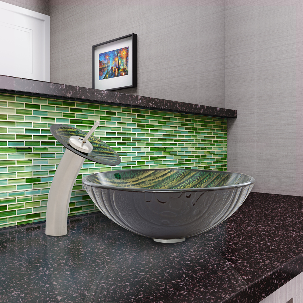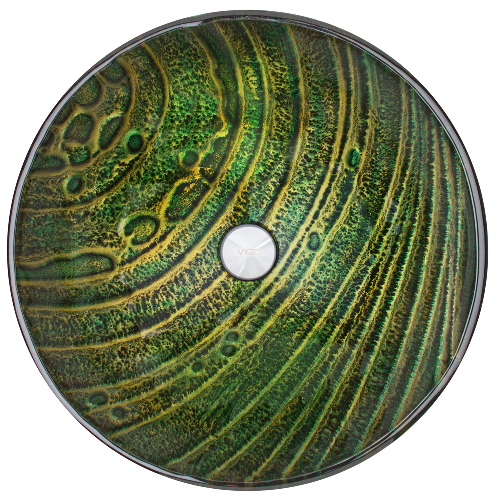 Your new bathroom will revolve around your Green Asteroid vessel sink by VIGO. The green and gold tones collide into an exciting pattern that looks like a ripple in your new sink.