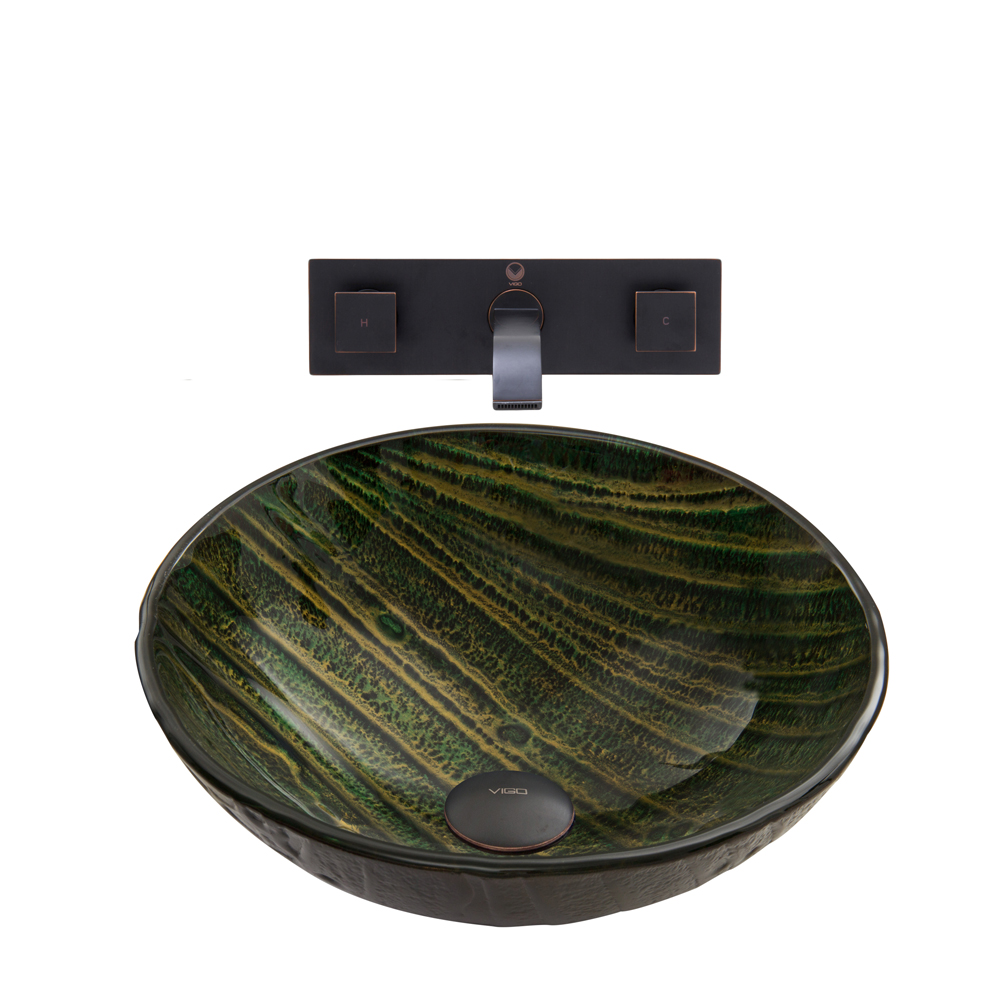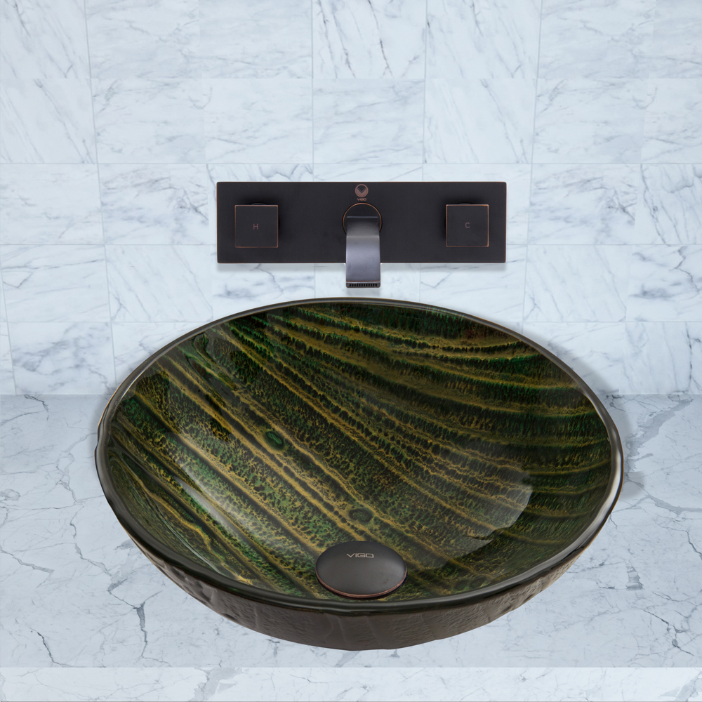 The VIGO Green Asteroid Glass Vessel Sink and Titus Wall Mount Faucet Set in Antique Rubbed Bronze Finish will create a clean and modern, yet smooth and sleek addition to your bathroom.