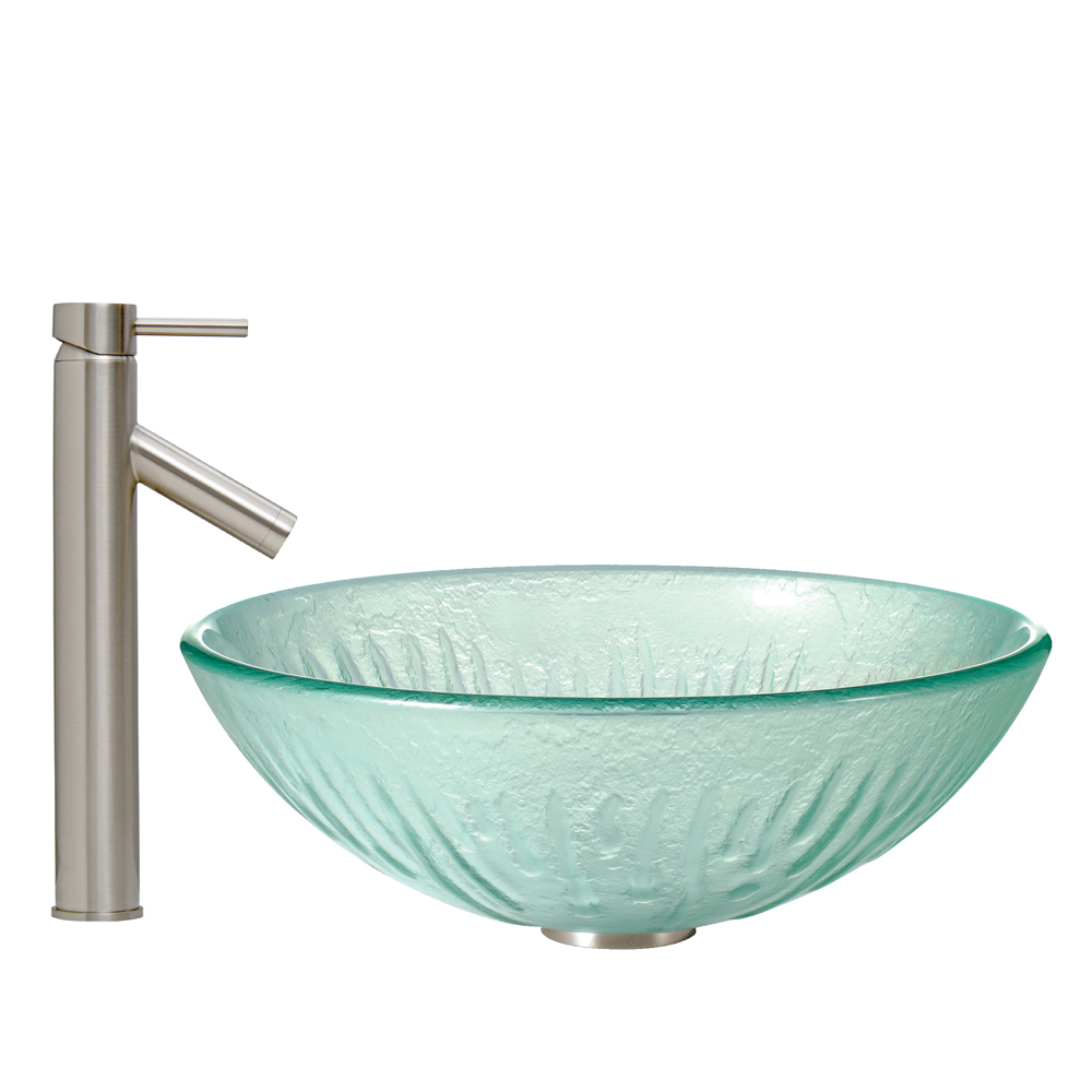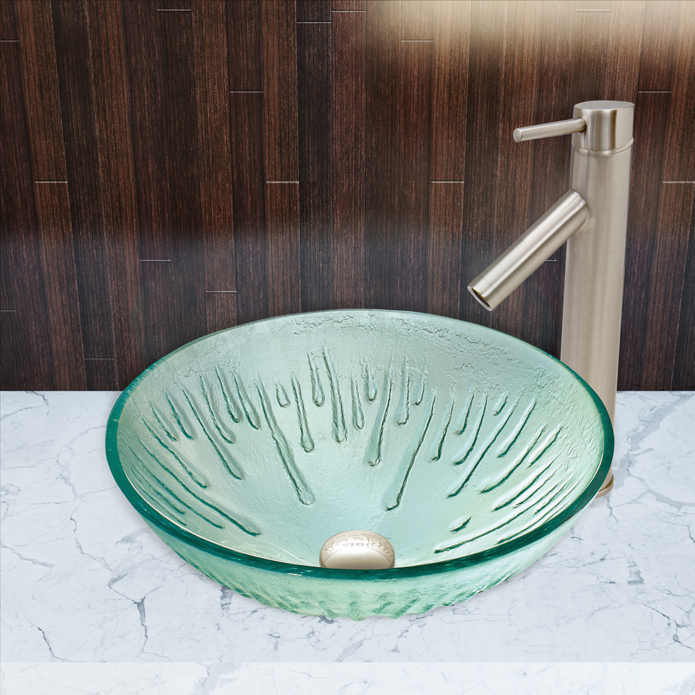 The VIGO Icicles Glass Vessel Sink and Dior Faucet Set in Brushed Nickel Finish is a luxurious and refreshing addition to any bathroom.