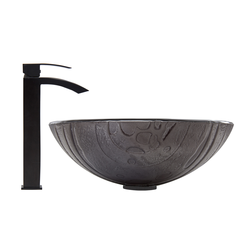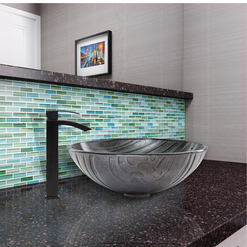 The VG07059 Interspace glass vessel bowl features dark black and gray curves, along with hints of silver that look out of this world.