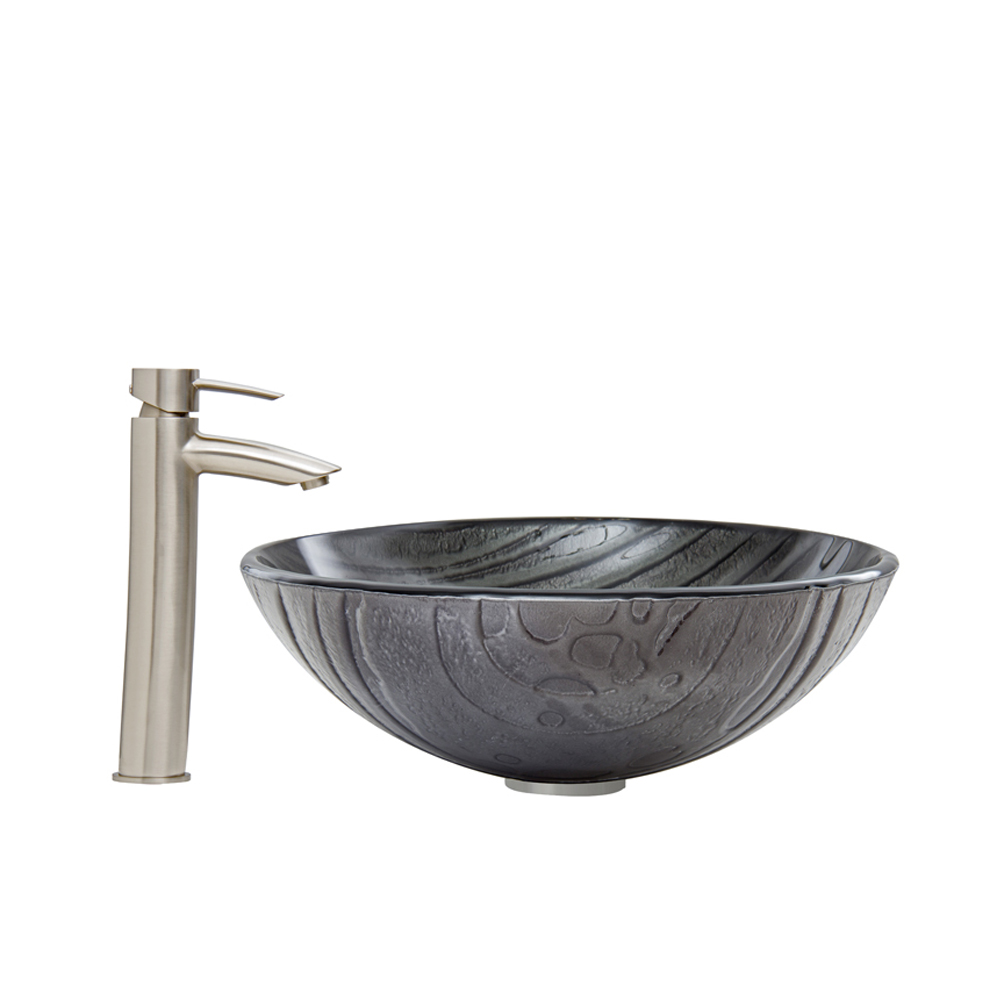 The VG07059 Interspace glass vessel bowl features dark black and gray curves, along with hints of silver that look out of this world.