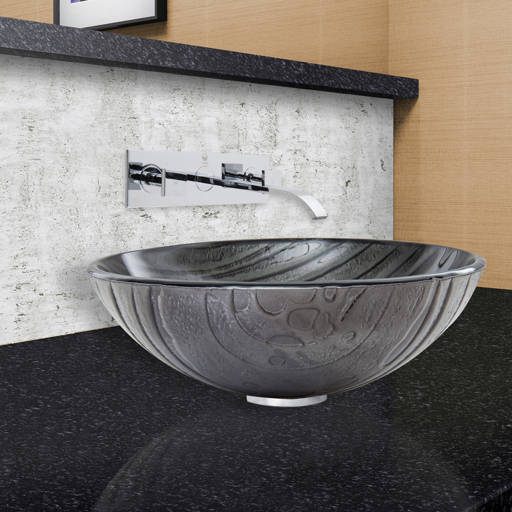 The VG07059 Interspace glass vessel bowl features dark black and gray curves, along with hints of silver that look out of this world.
