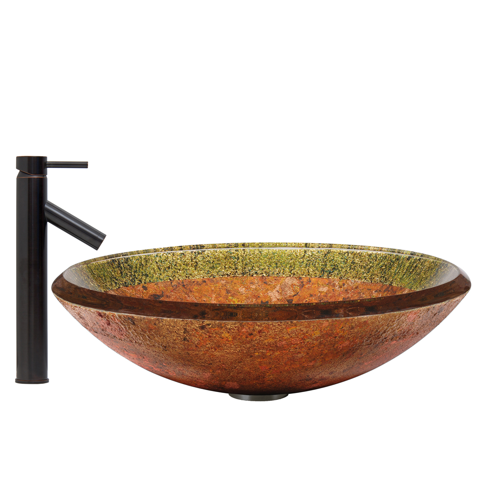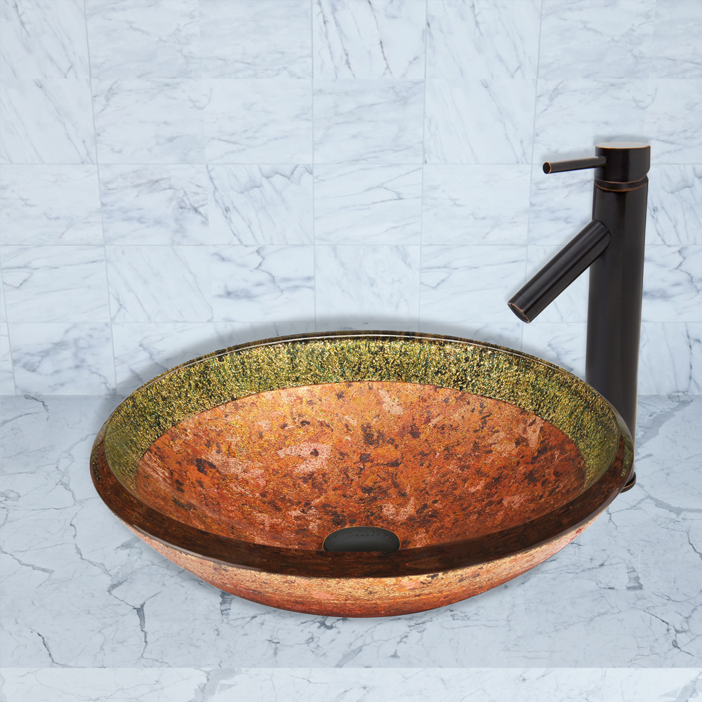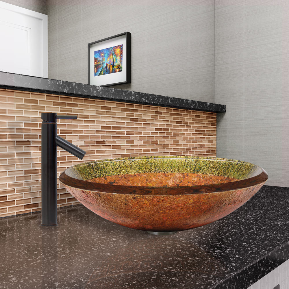 The VG07021 Janus glass vessel bowl combines vintage styling with modern design, featuring a multiple shades of browns and orange, topped by sparkling green tones.