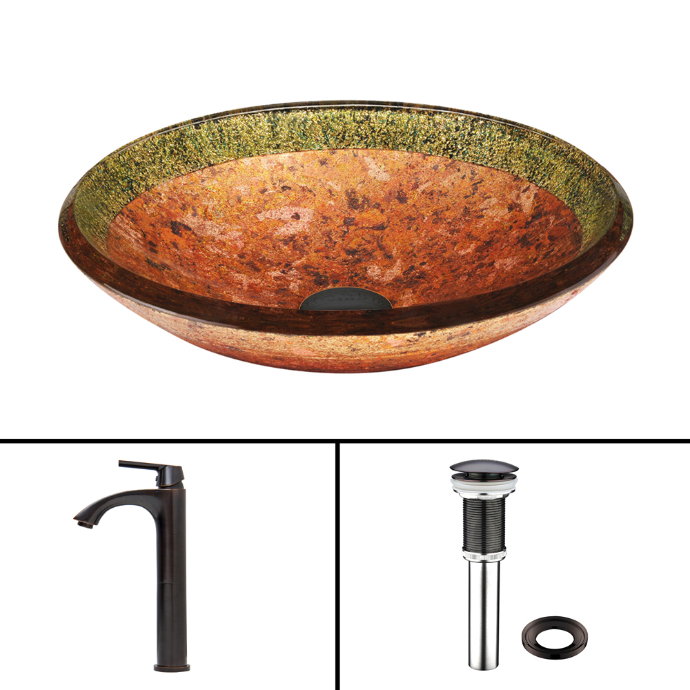 The VIGO Janus Glass Vessel Sink and Linus Faucet Set in Antique Rubbed Bronze Finish will provide a luxurious style to any bathroom.