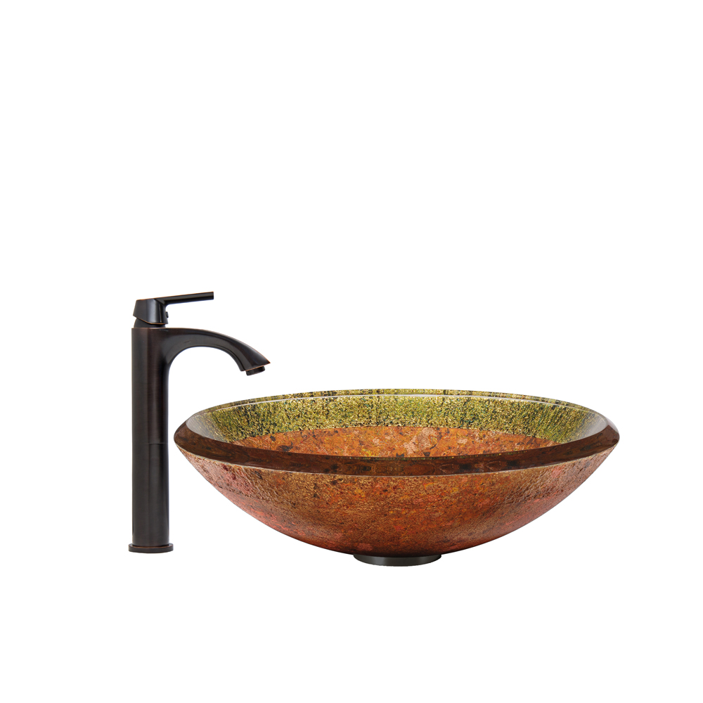 The VG07021 Janus glass vessel bowl combines vintage styling with modern design, featuring a multiple shades of browns and orange, topped by sparkling green tones.