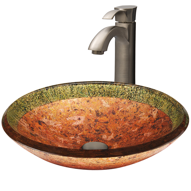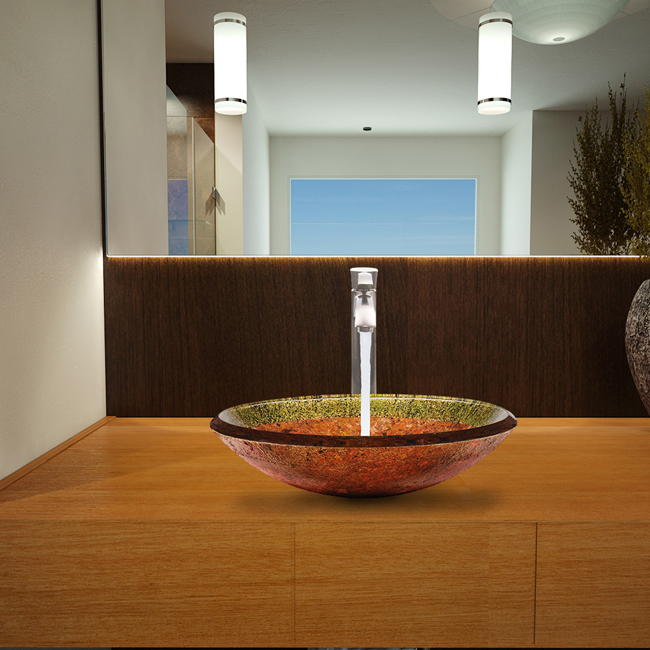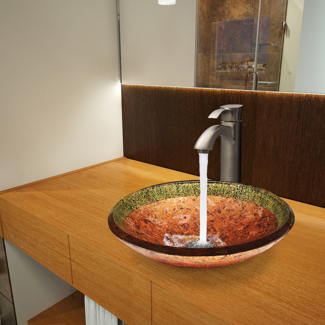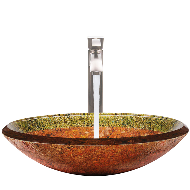The VG07021 glass vessel bowl combines vintage styling with modern design, featuring a multicolor surrounded by sparkling green tones.
