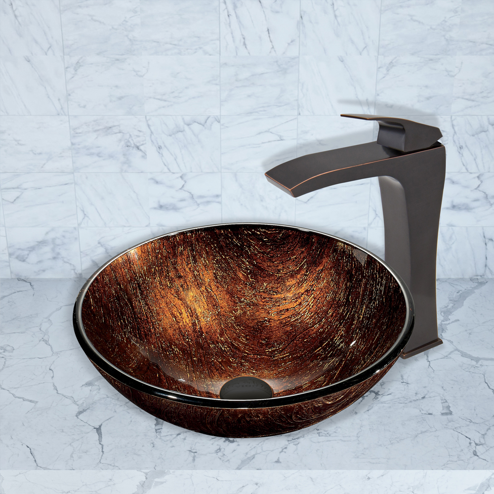 The VIGO Kenyan Twilight Glass Vessel Sink and Blackstonian Faucet Set in Antique Rubbed Bronze Finish will bring your bathroom the striking design and modern look it is missing.