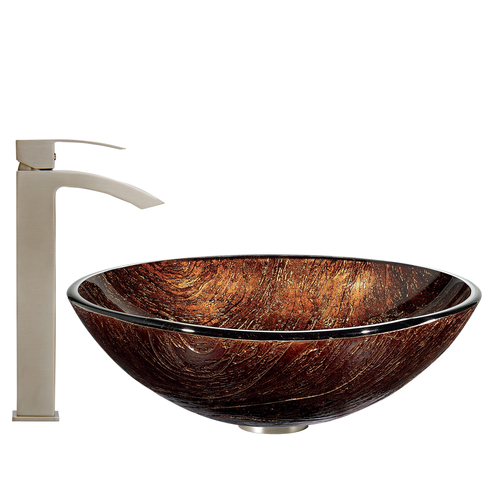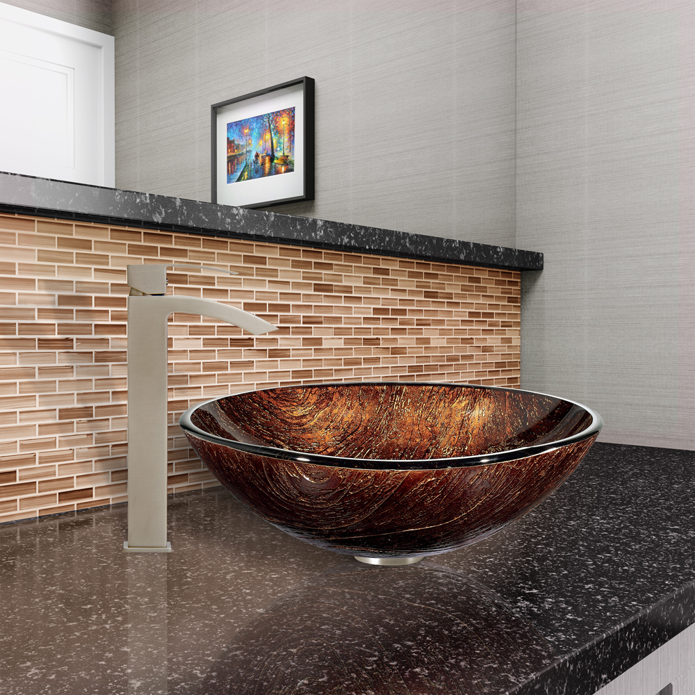 The VIGO Kenyan Twilight Glass Vessel Sink and Duris Faucet Set in Brushed Nickel Finish is a warm and modern addition to your bathroom.