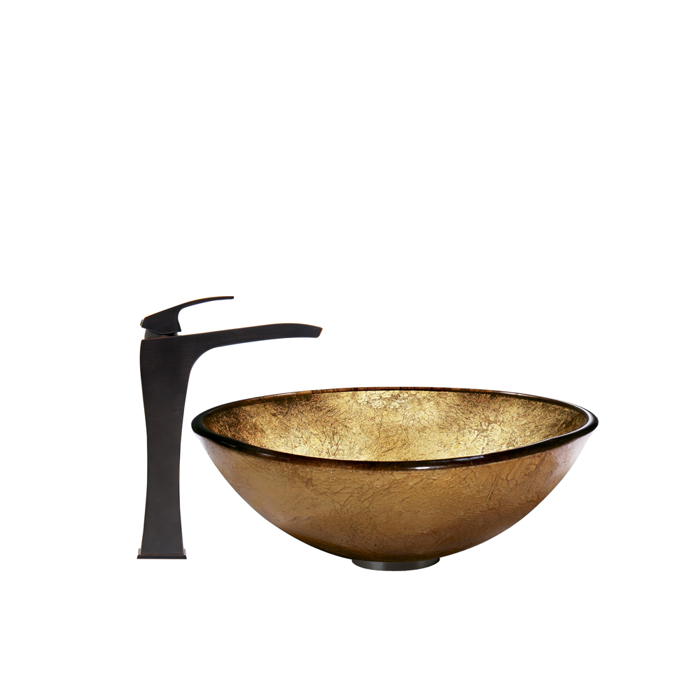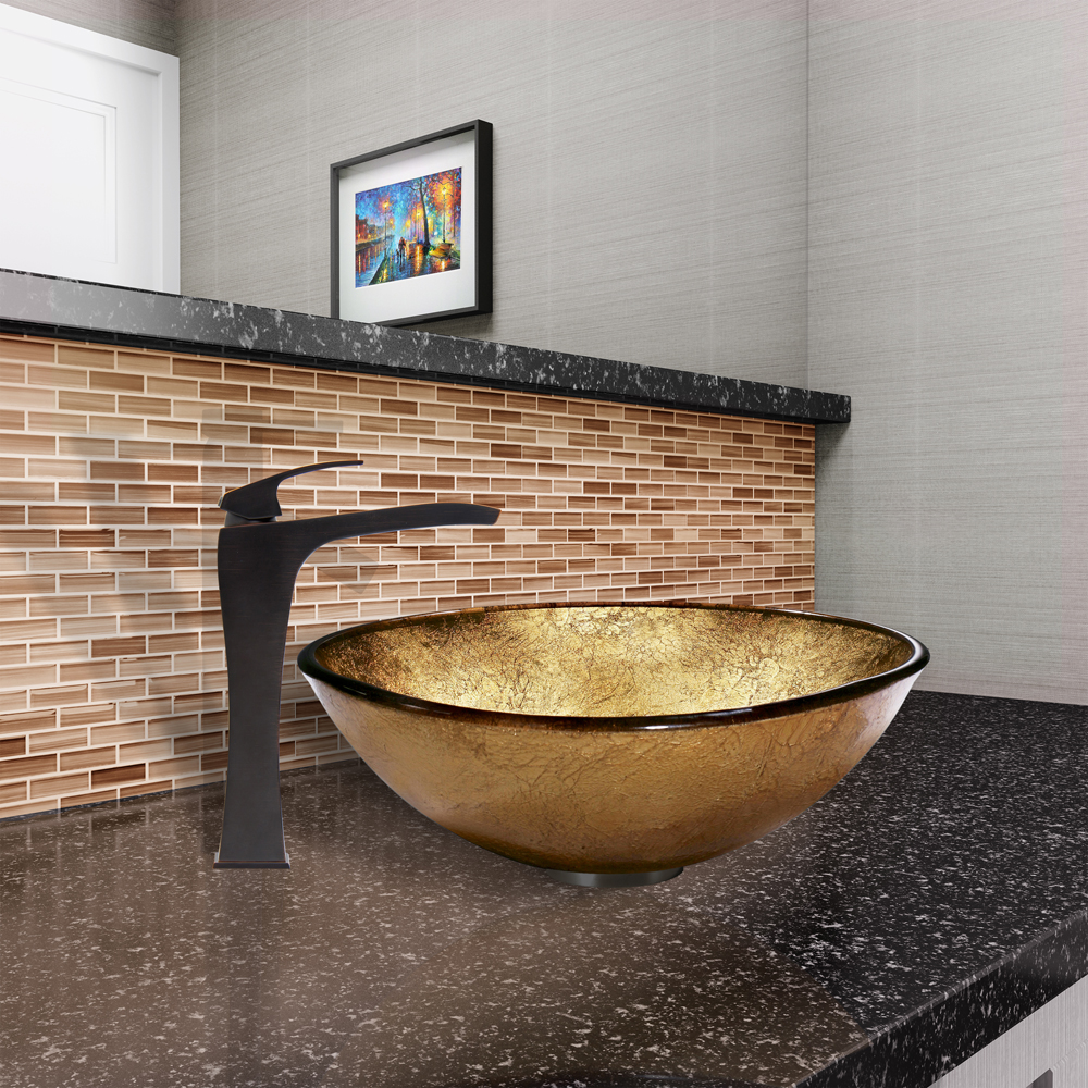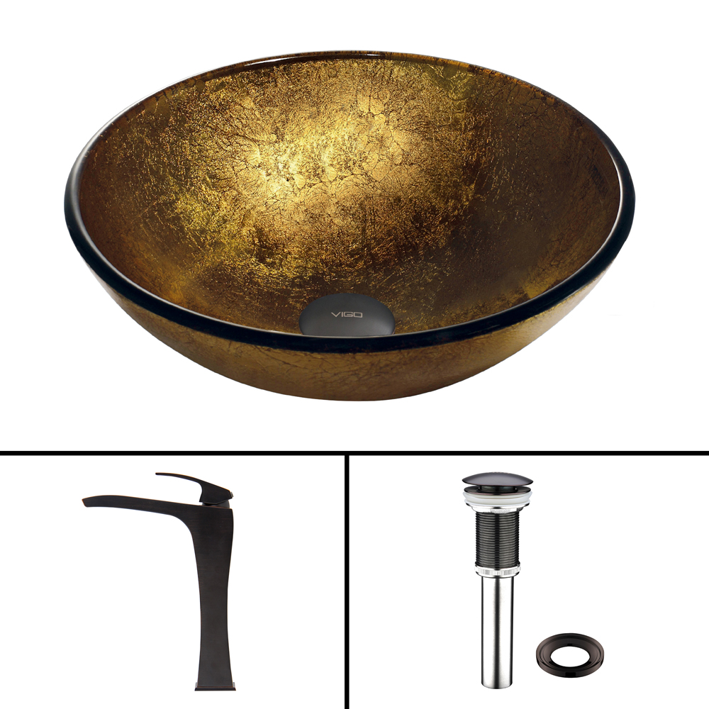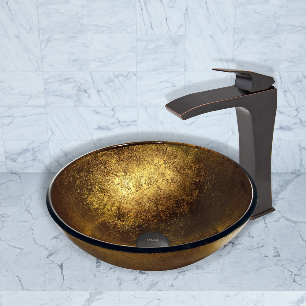 The VIGO Liquid Gold Glass Vessel Sink and Blackstonian Faucet Set in Antique Rubbed Bronze Finish is an elegant, yet bold addition to your bathroom.