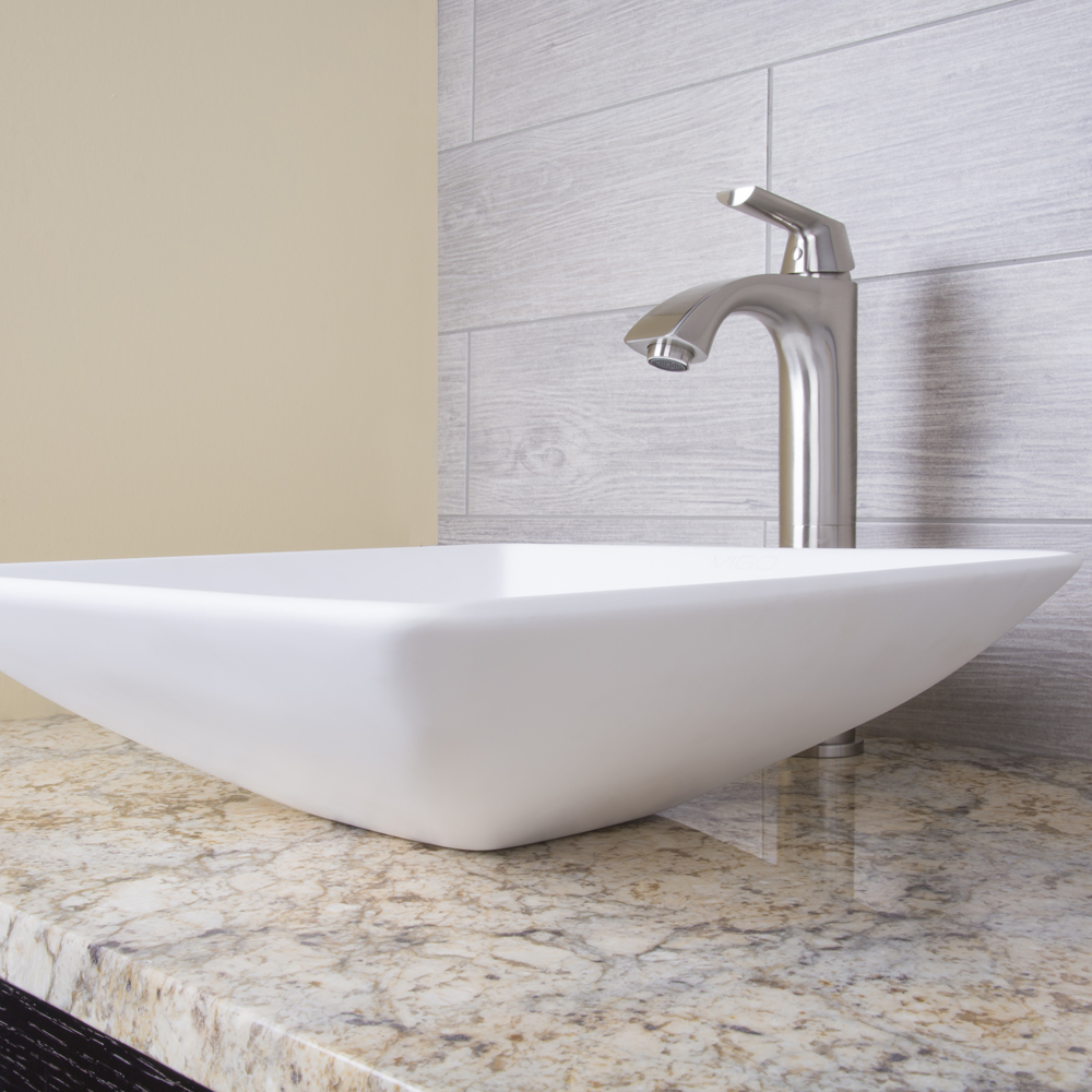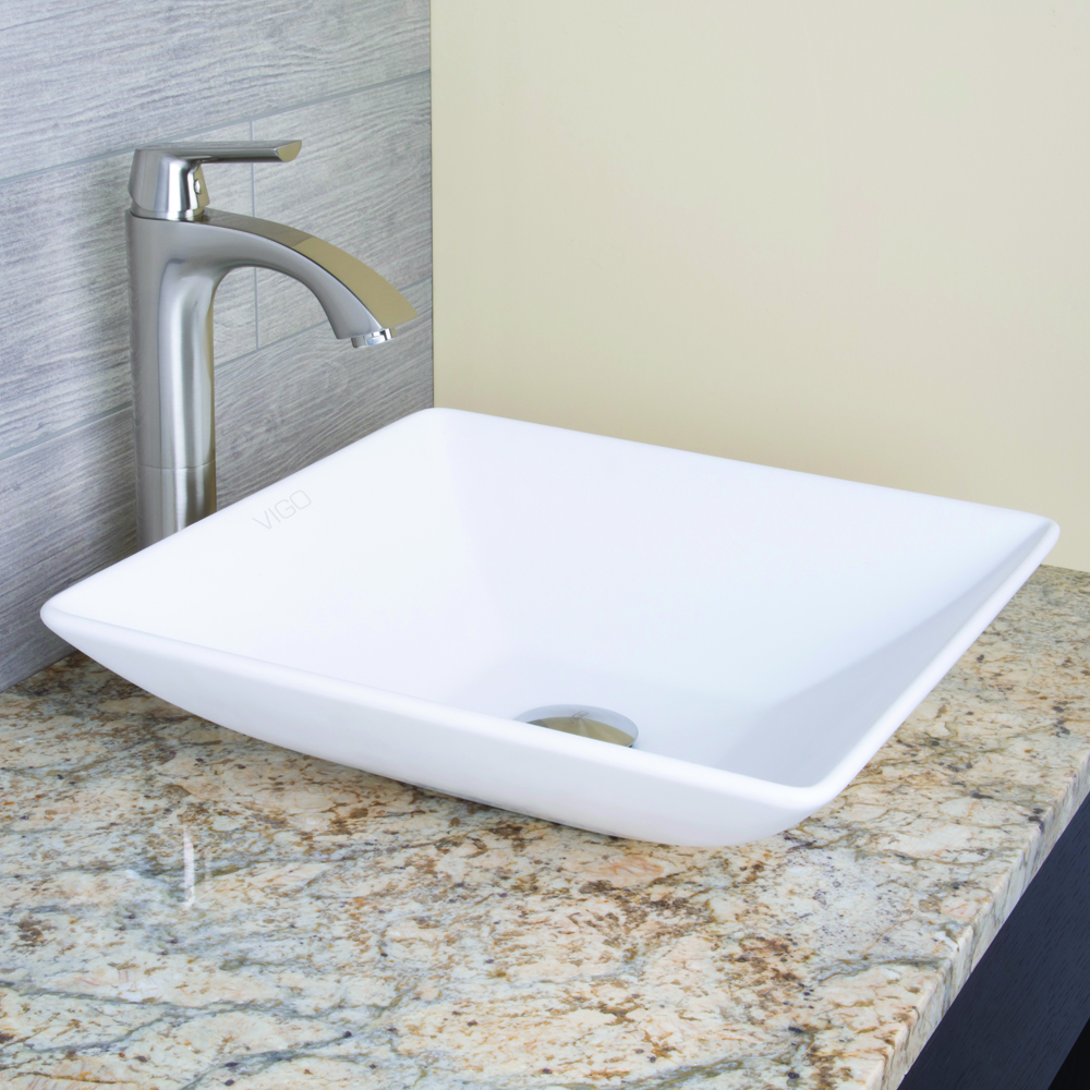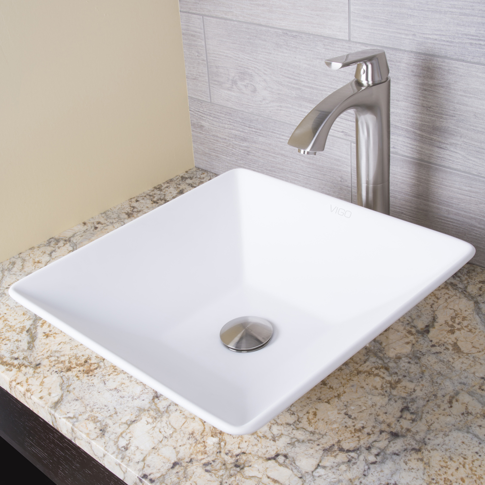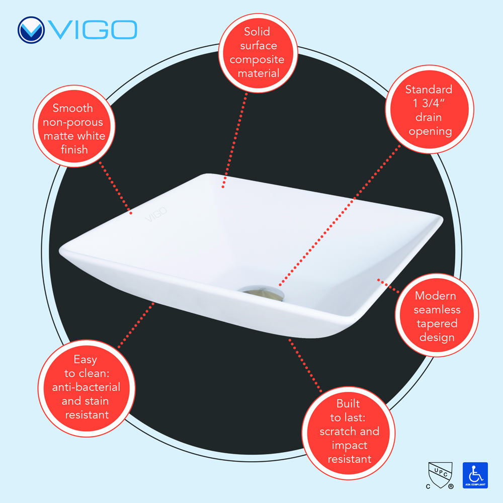 The square VG04004 Matira Matte Stone Vessel Sink has a luxuriously smooth, matte white surface