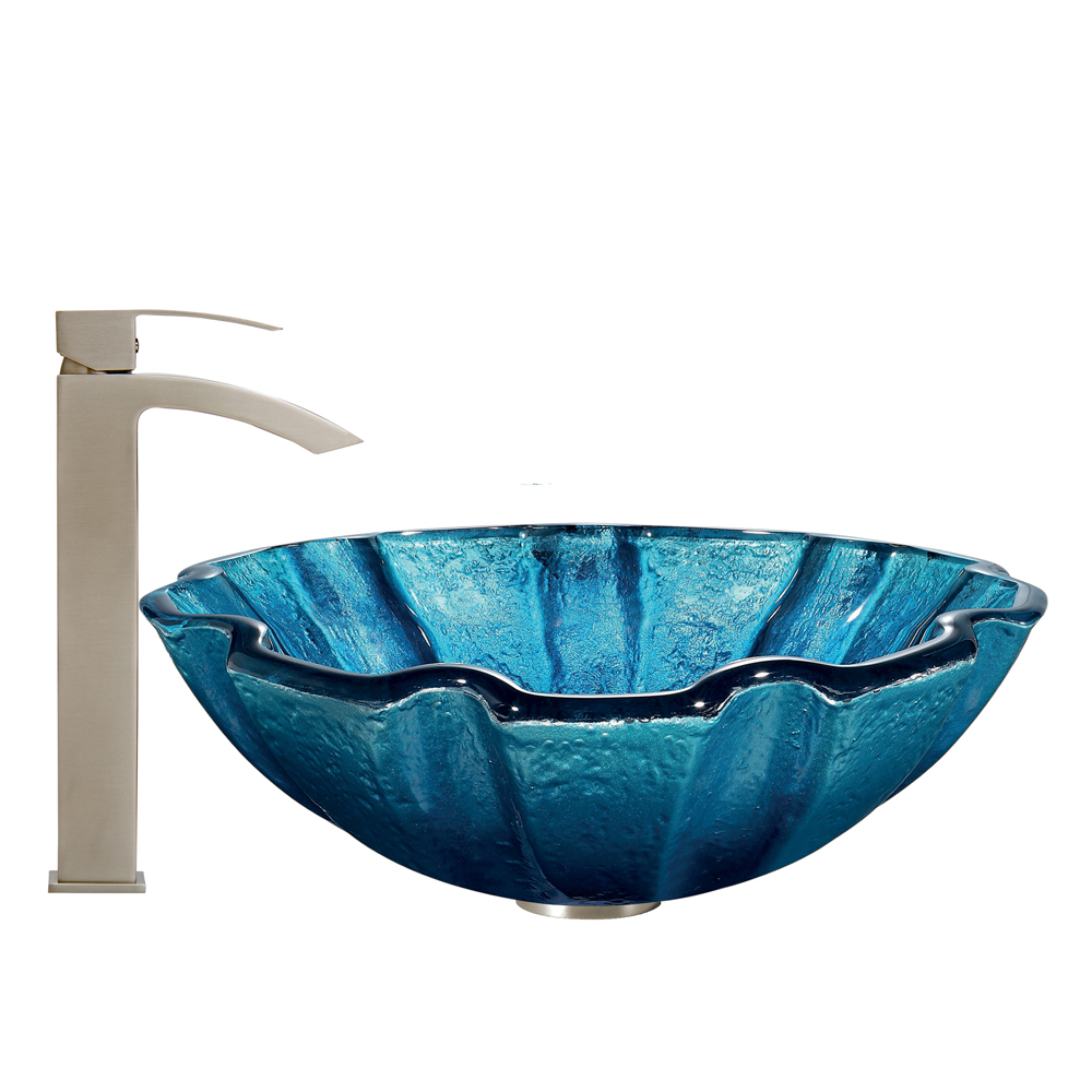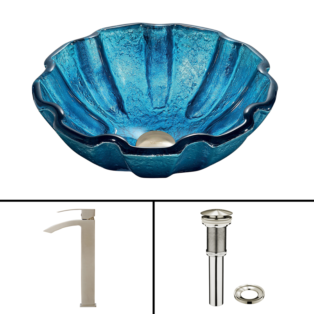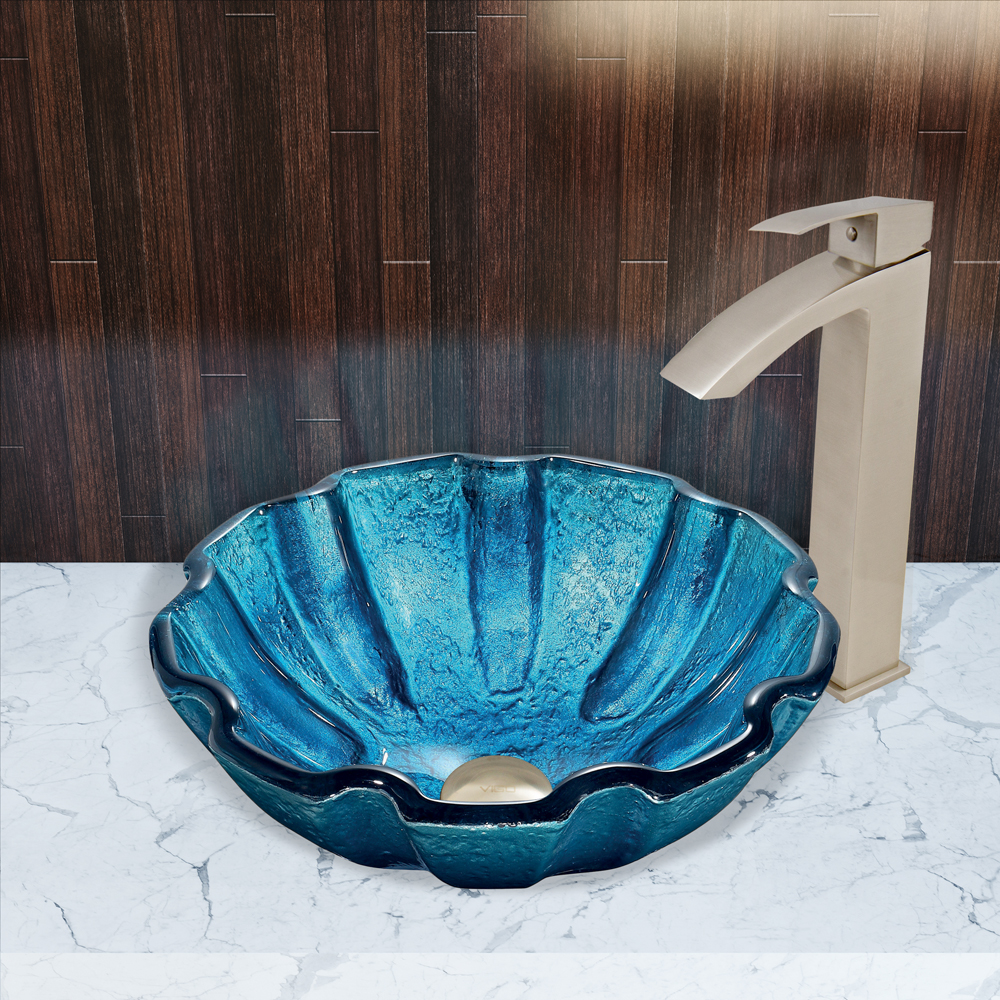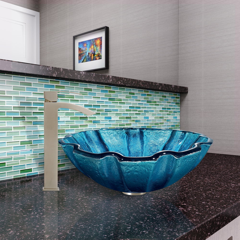 The VIGO Mediterranean Seashell Glass Vessel Sink and Duris Faucet Set in Brushed Nickel Finish will bring your bathroom the striking design and modern look it is missing.
