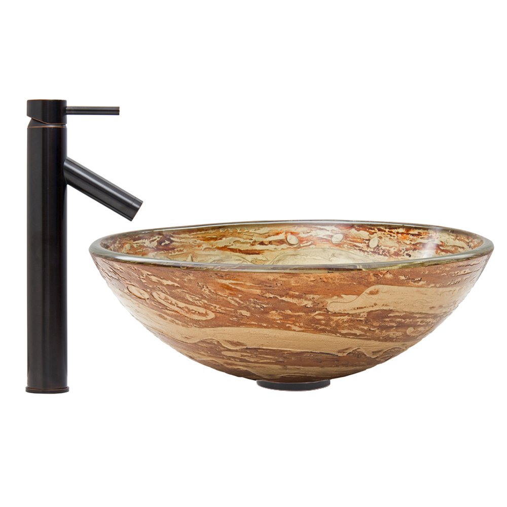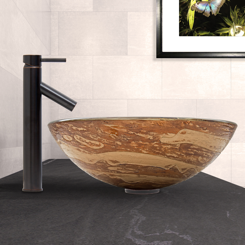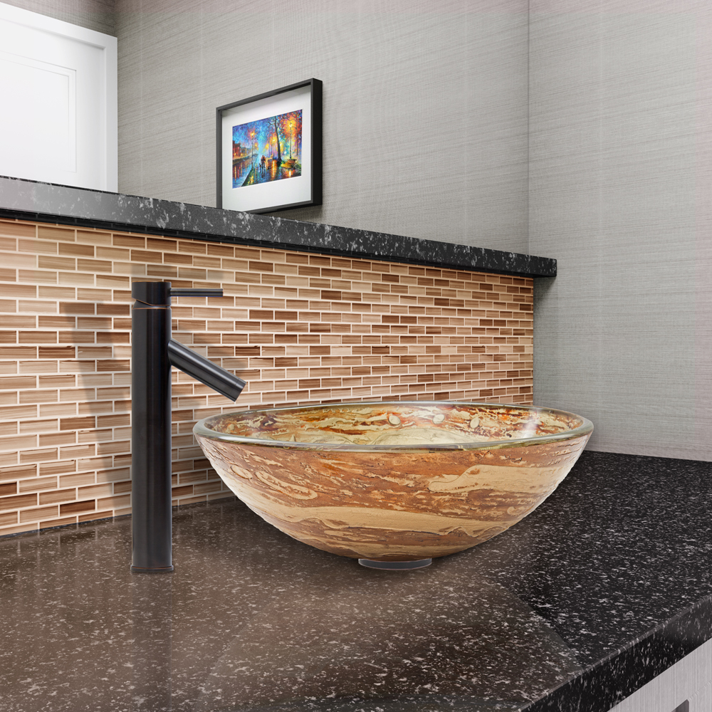 The VIGO Mocha Swirl Glass Vessel Sink and Dior Faucet Set in Antique Rubbed Bronze Finish is certain to be a tasteful elegance in your home.