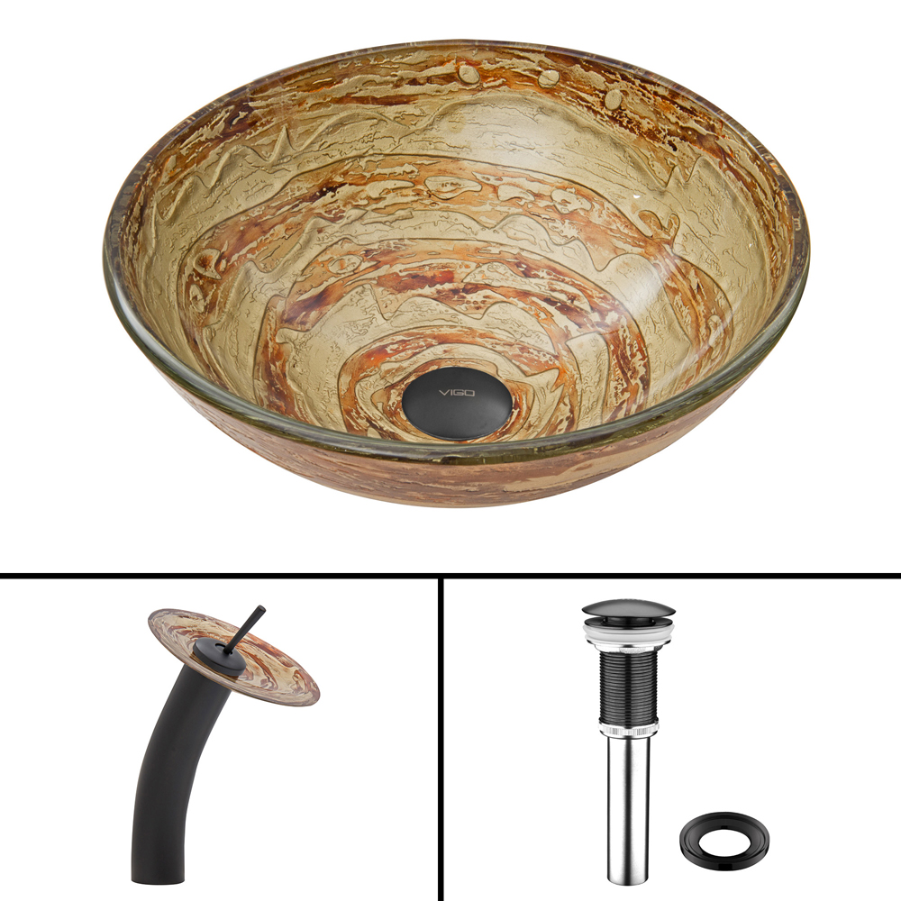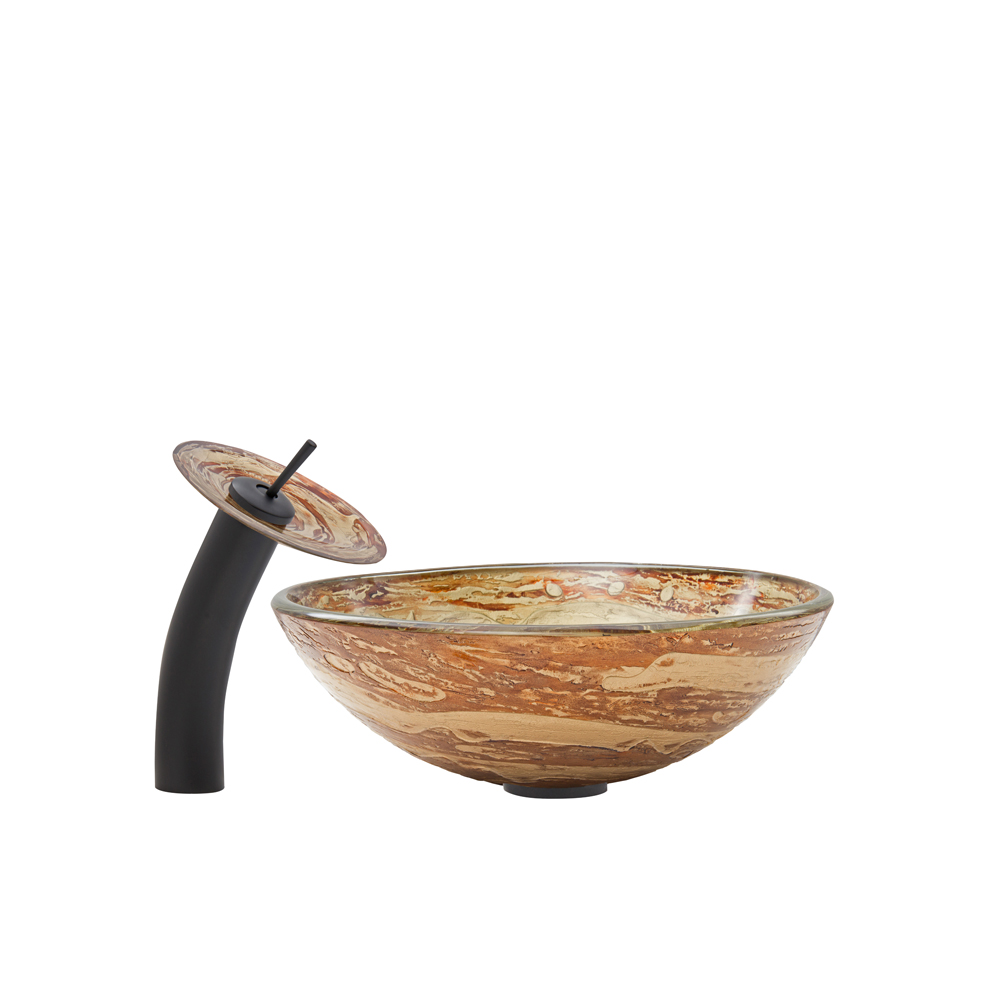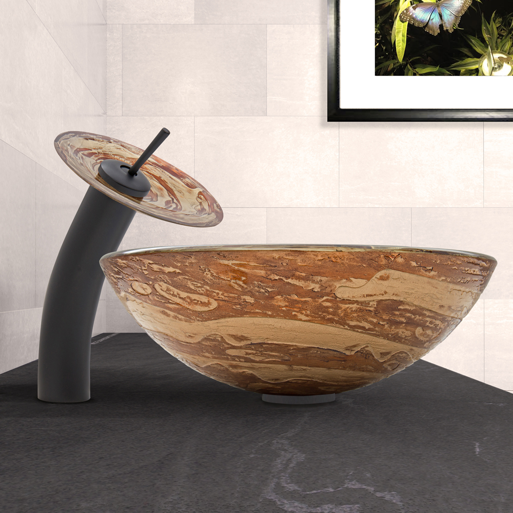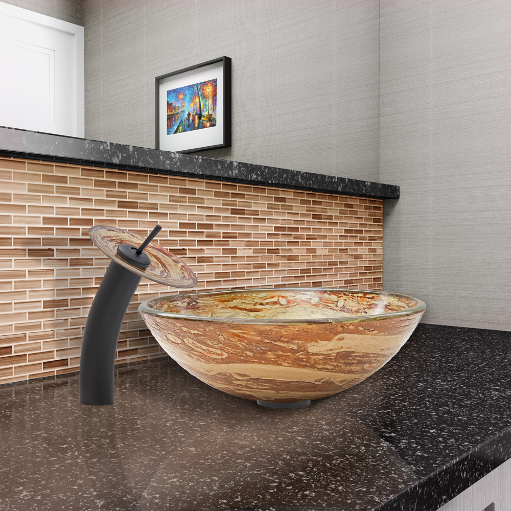 The VIGO Mocha Swirl Glass Vessel Sink and Waterfall Faucet Set in Matte Black Finish is certain to be a tasteful elegance in your home.