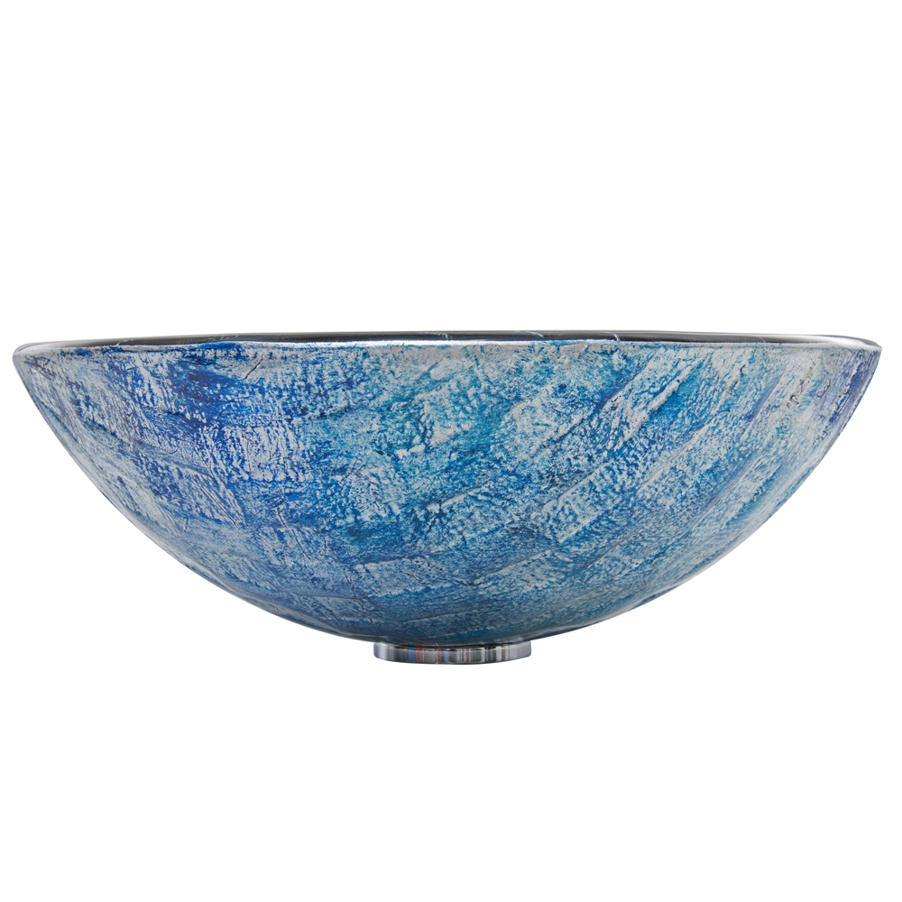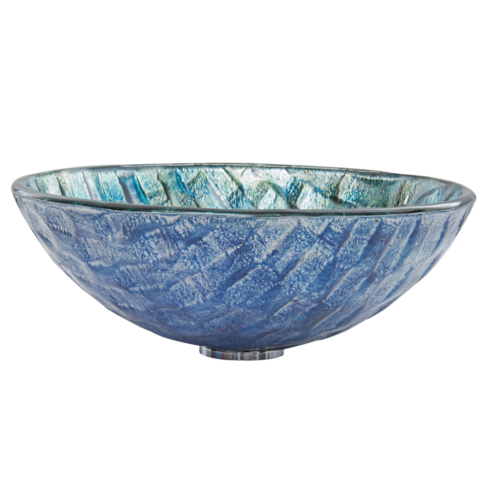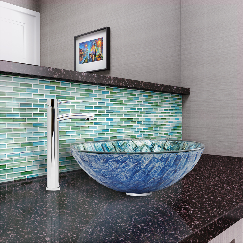 The VG07049 Oceania glass vessel bowl features aqua blue, and sea green colors in a wave-like pattern, brining the ocean to your bathroom.
