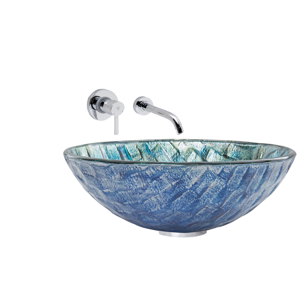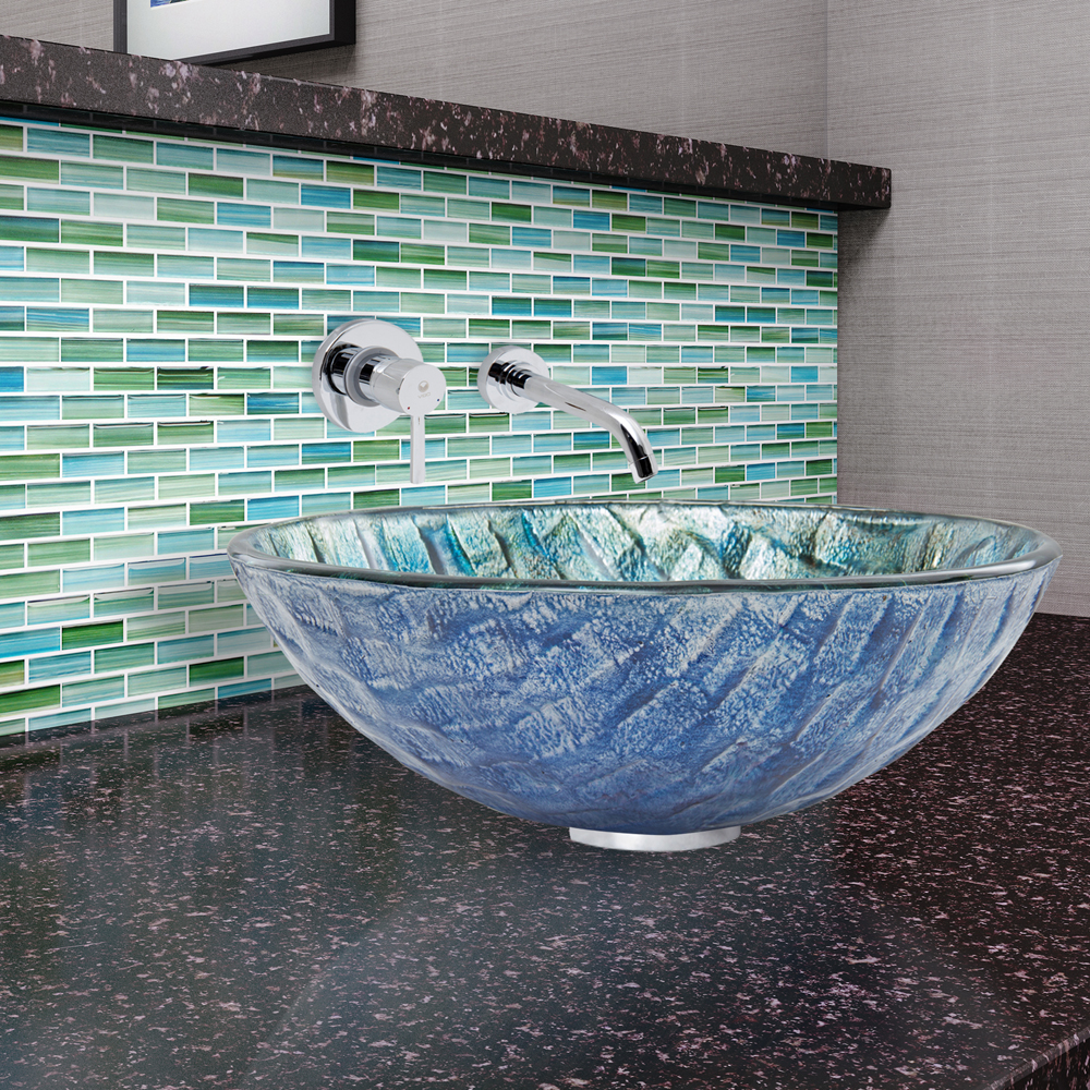 The VG07049 Oceania glass vessel bowl features aqua blue, and sea green colors in a wave-like pattern, brining the ocean to your bathroom.