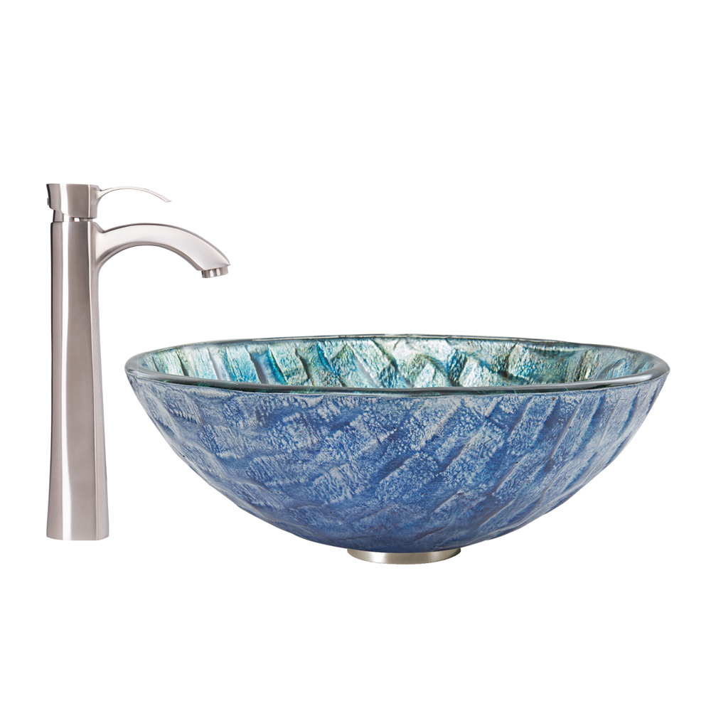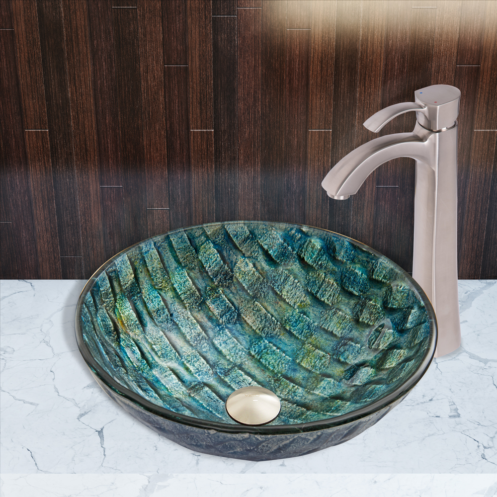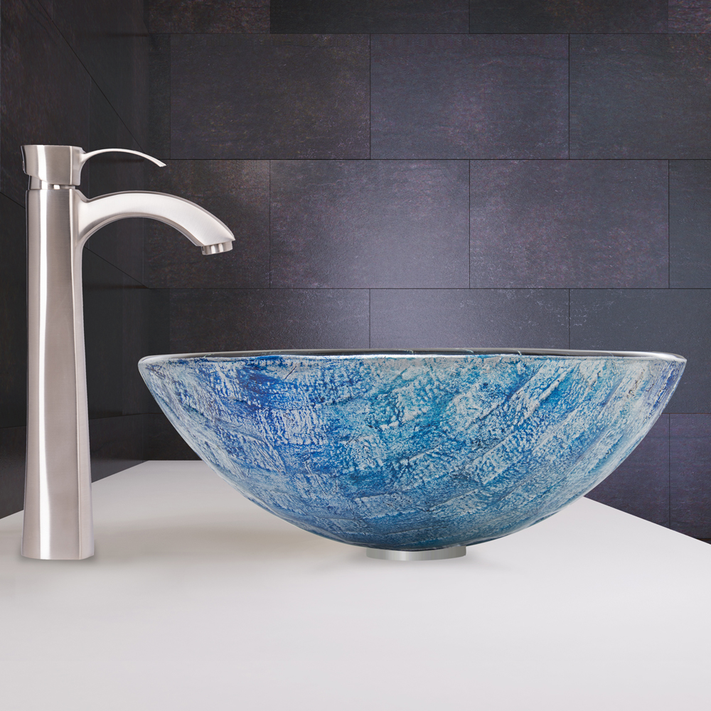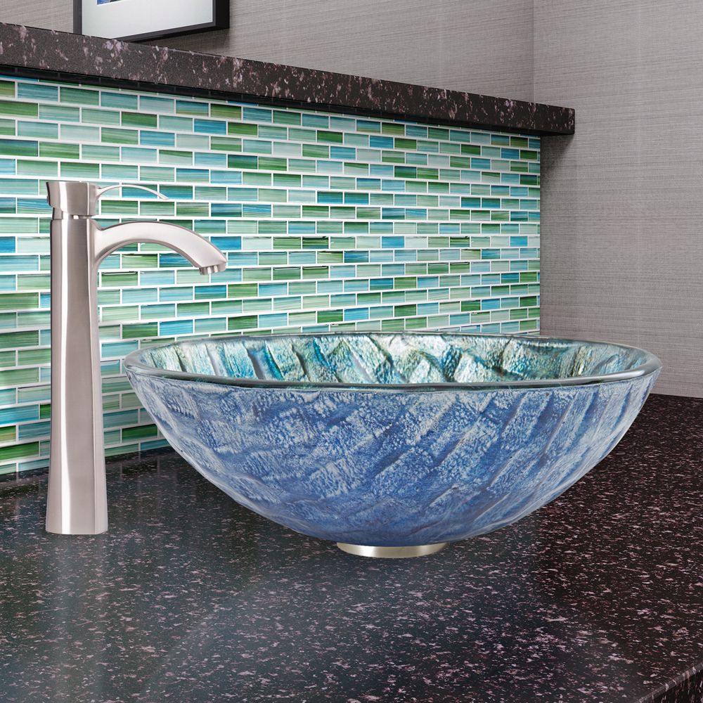 The VG07049 Oceania glass vessel bowl features aqua blue, and sea green colors in a wave-like pattern, brining the ocean to your bathroom.
