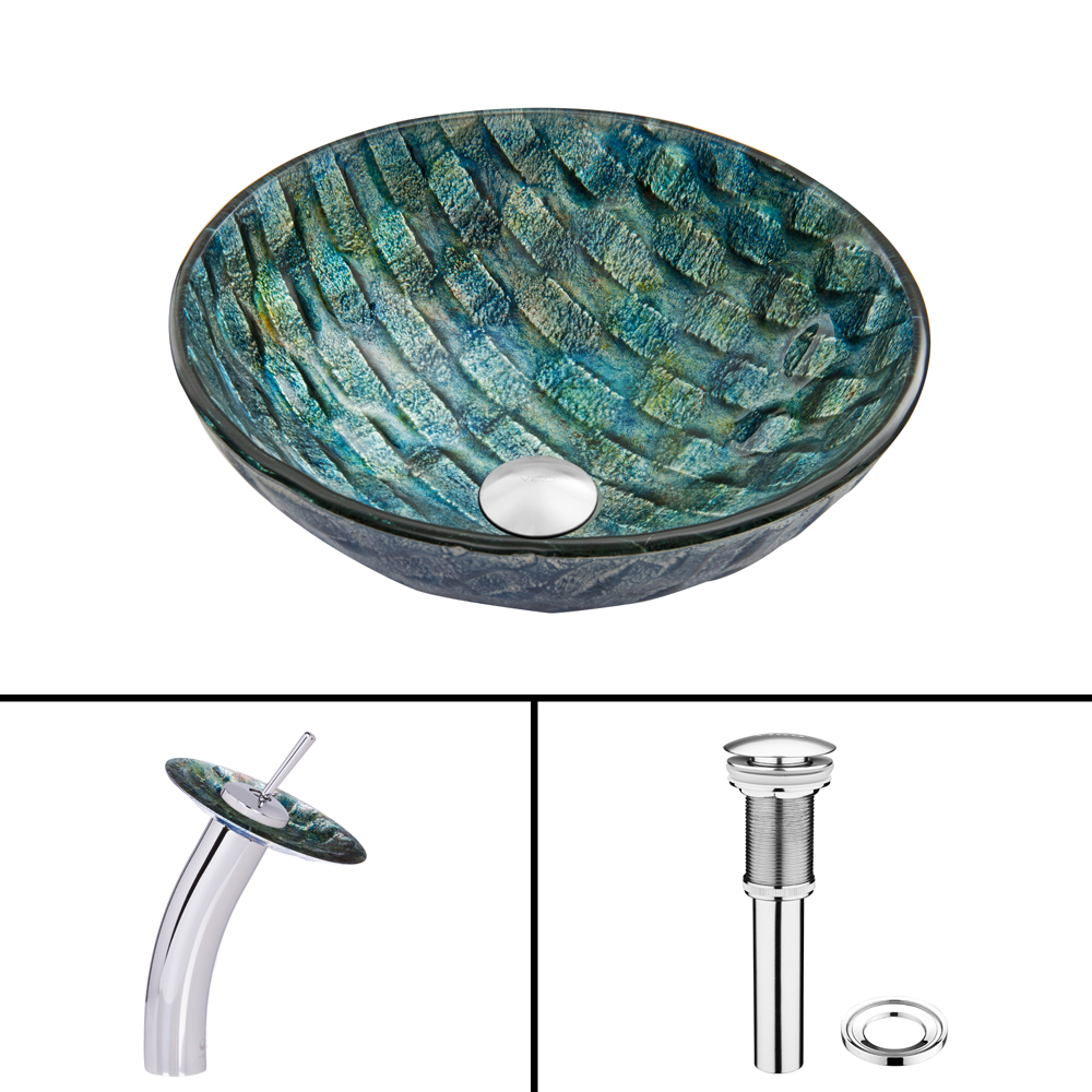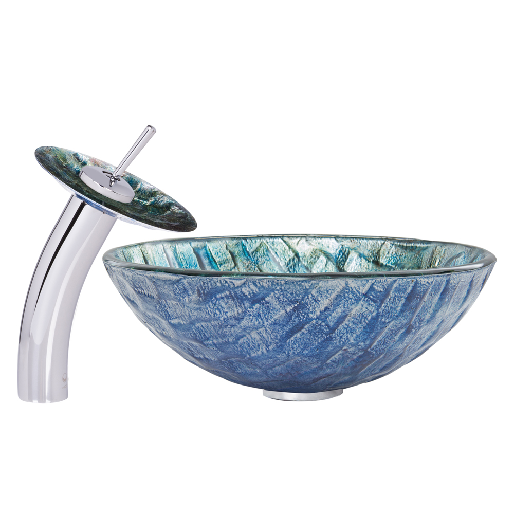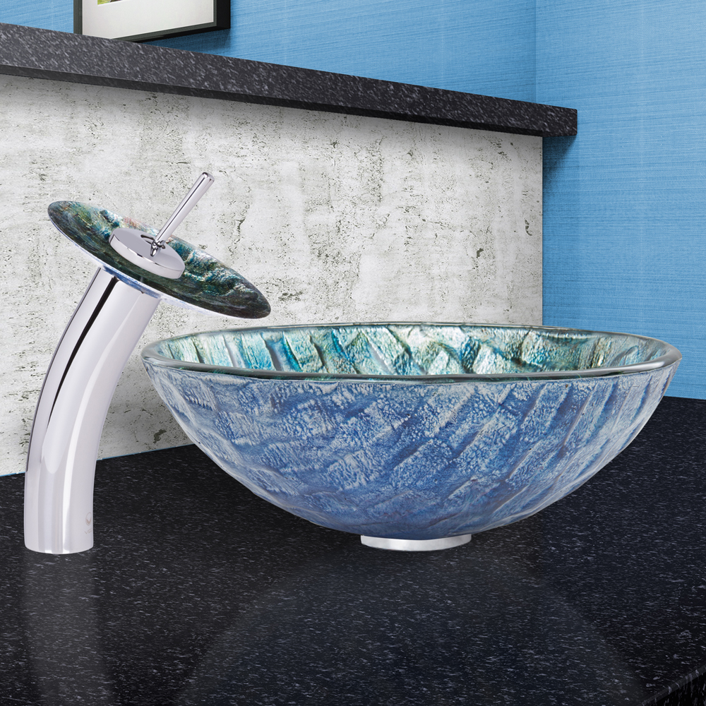 Imagine ocean blue waves in your beachy bathroom. The gorgeous Oceania vessel sink and matching waterfall faucet in chrome by VIGO mixes aqua blue and sea green in a wavy pattern to bring the ocean to your bathroom.