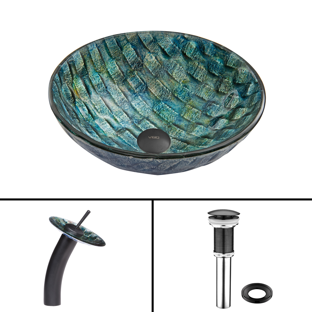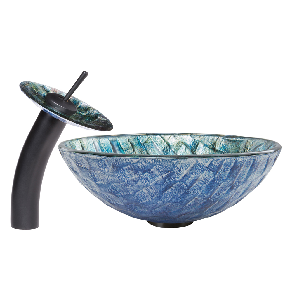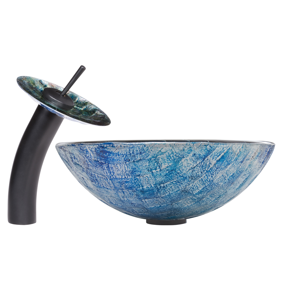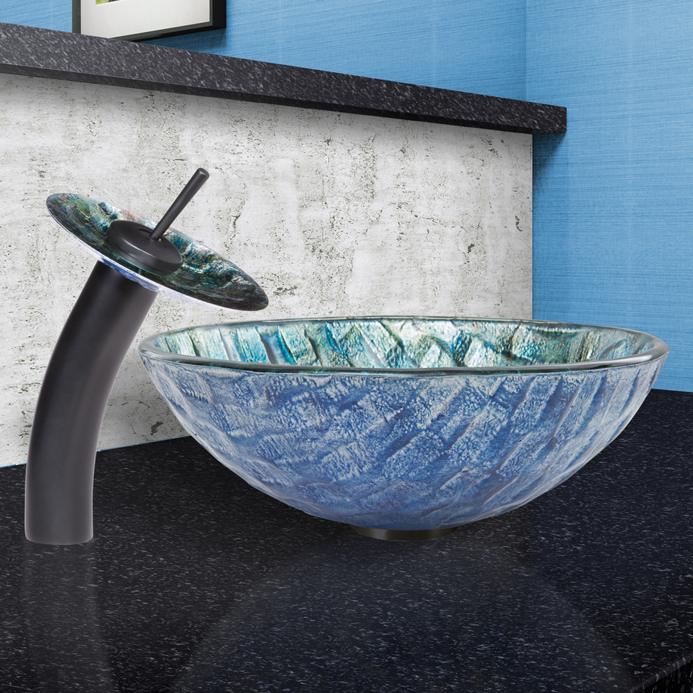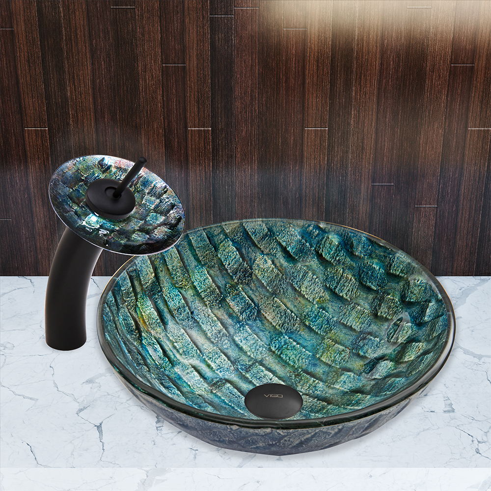 Imagine ocean blue waves in your beachy bathroom. The gorgeous Oceania vessel sink and matching waterfall faucet in matte black by VIGO mixes aqua blue and sea green in a wavy pattern to bring the ocean to your bathroom.