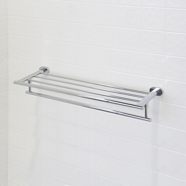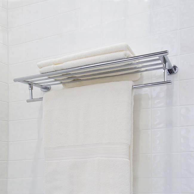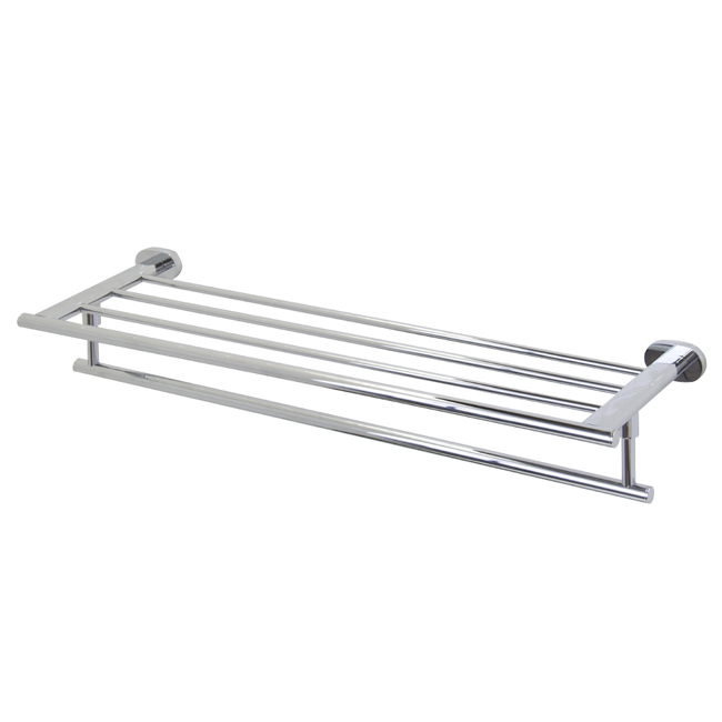 The VIGO Ovando 24" Round Design Hotel Style Rack and Towel Bar in Chrome provides a modern and stylish way to keep a supply of towels or accessories conveniently at hand.