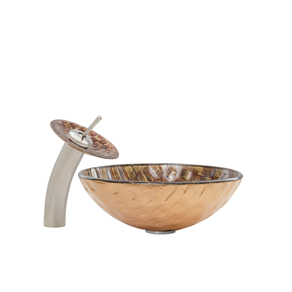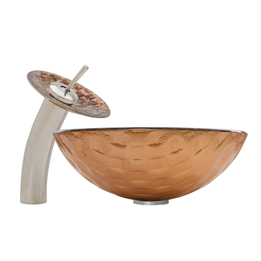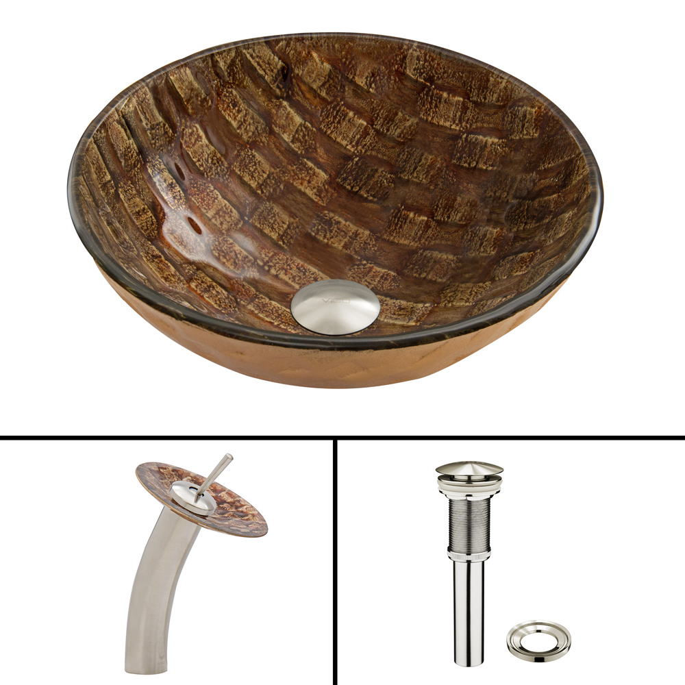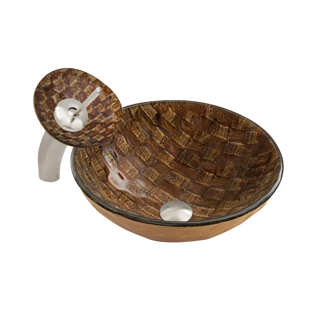 Update your beachy bathroom with the VIGO Playa vessel sink and matching waterfall faucet in brushed nickel. The sand colored weave pattern is an eye-catching design for your bathroom.