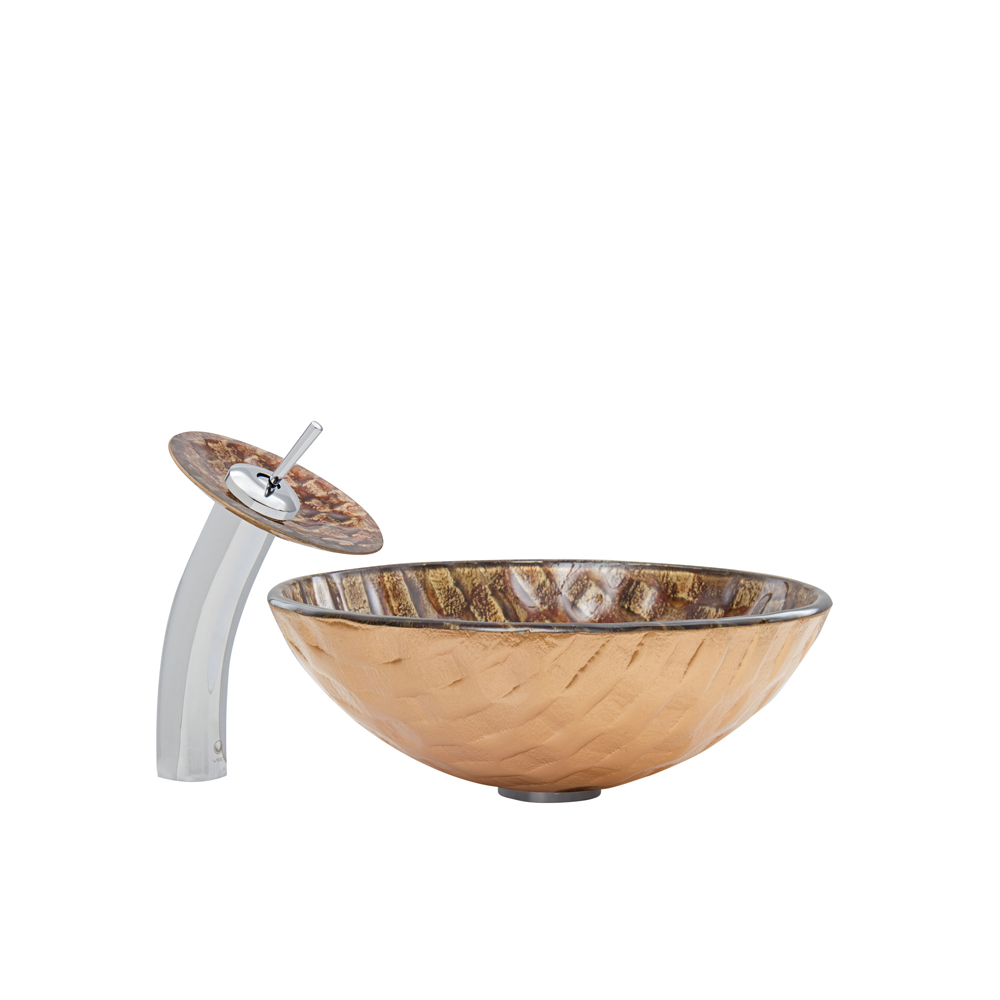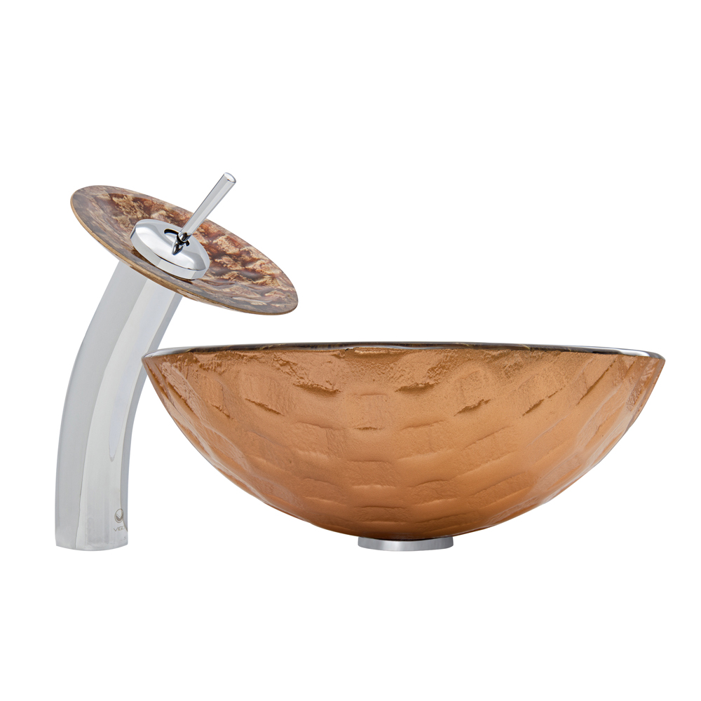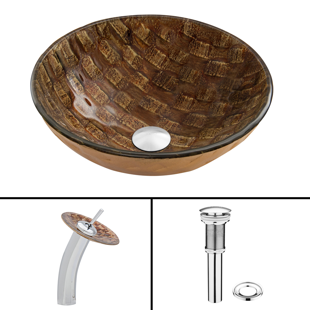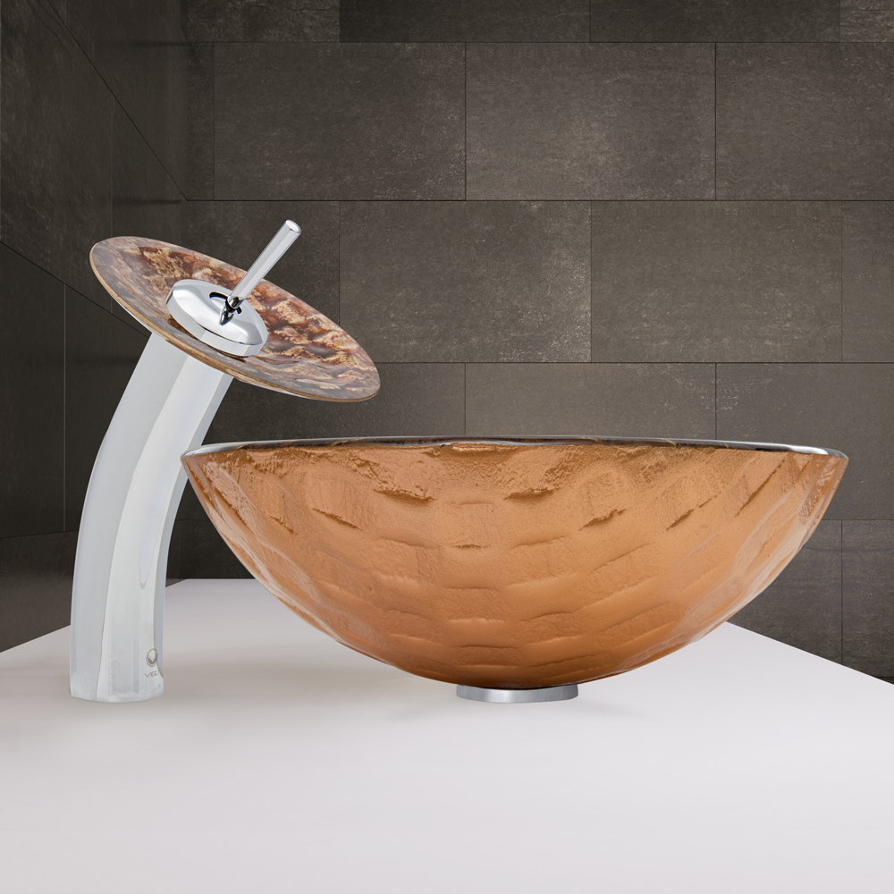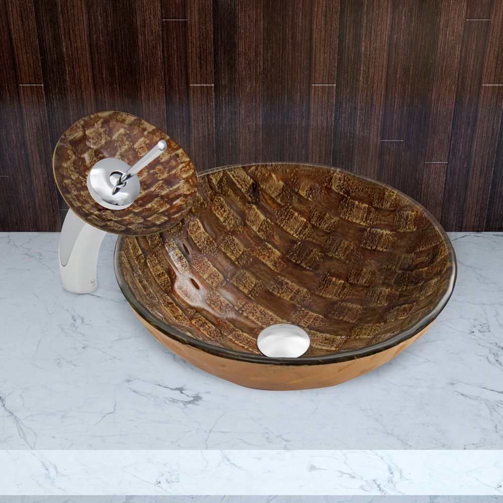 Update your beachy bathroom with the VIGO Playa vessel sink and matching waterfall faucet in chrome. The sand colored weave pattern is an eye-catching design for your bathroom.