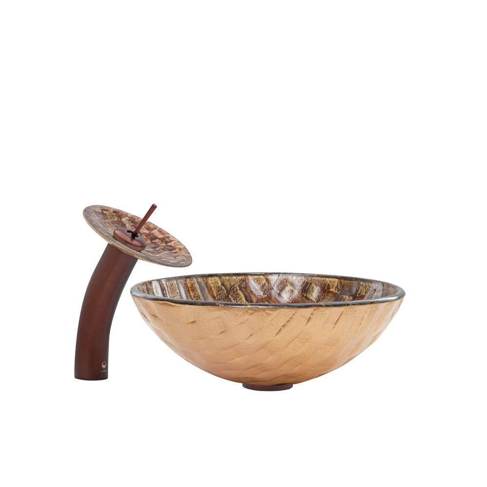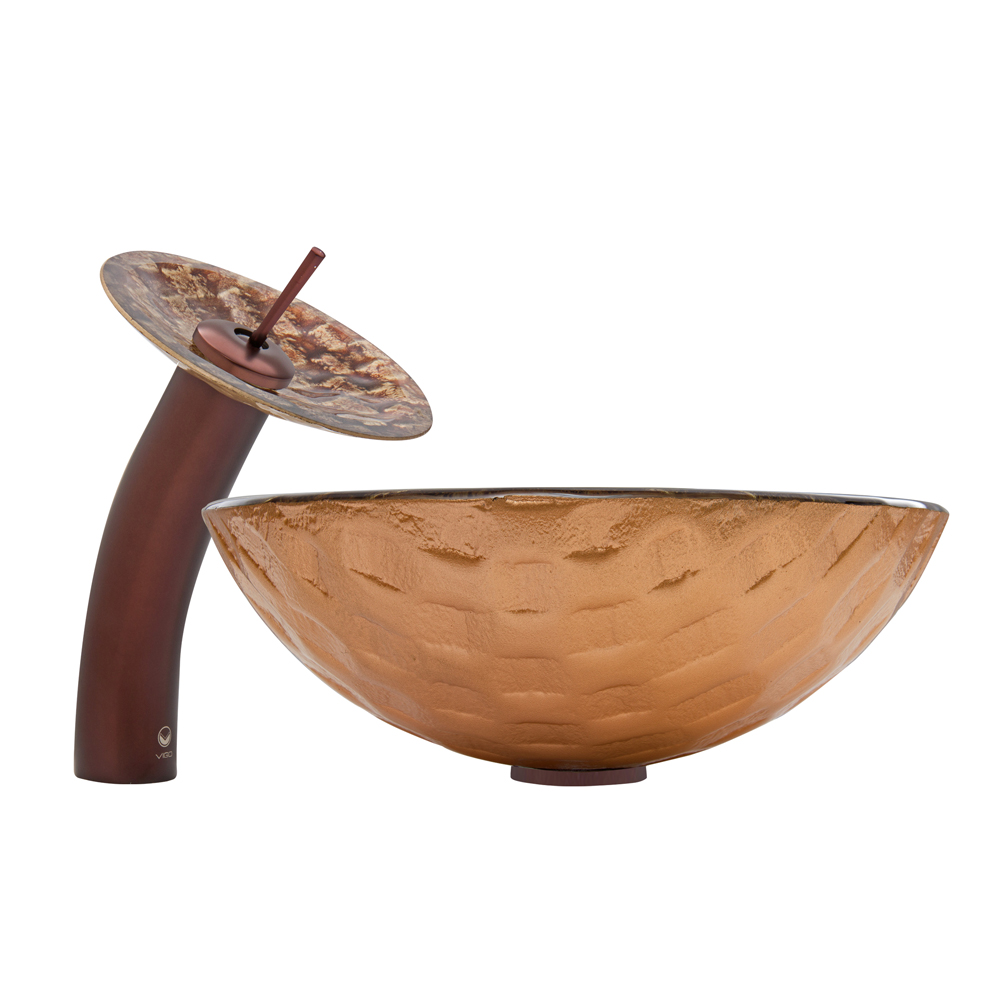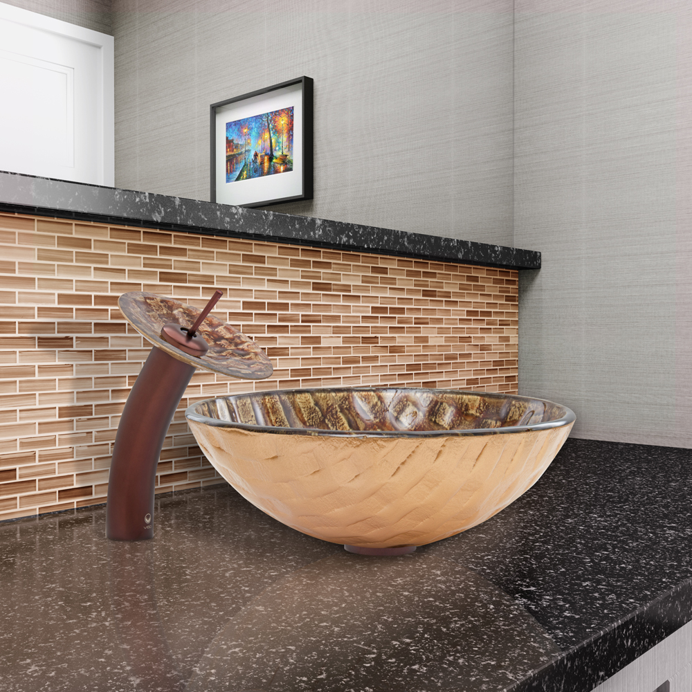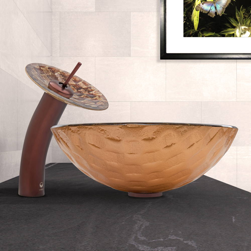 The VIGO Playa Glass Vessel Sink and Waterfall Faucet Set in Oil Rubbed Bronze Finish is sure to make any bathroom completely unforgettable.
