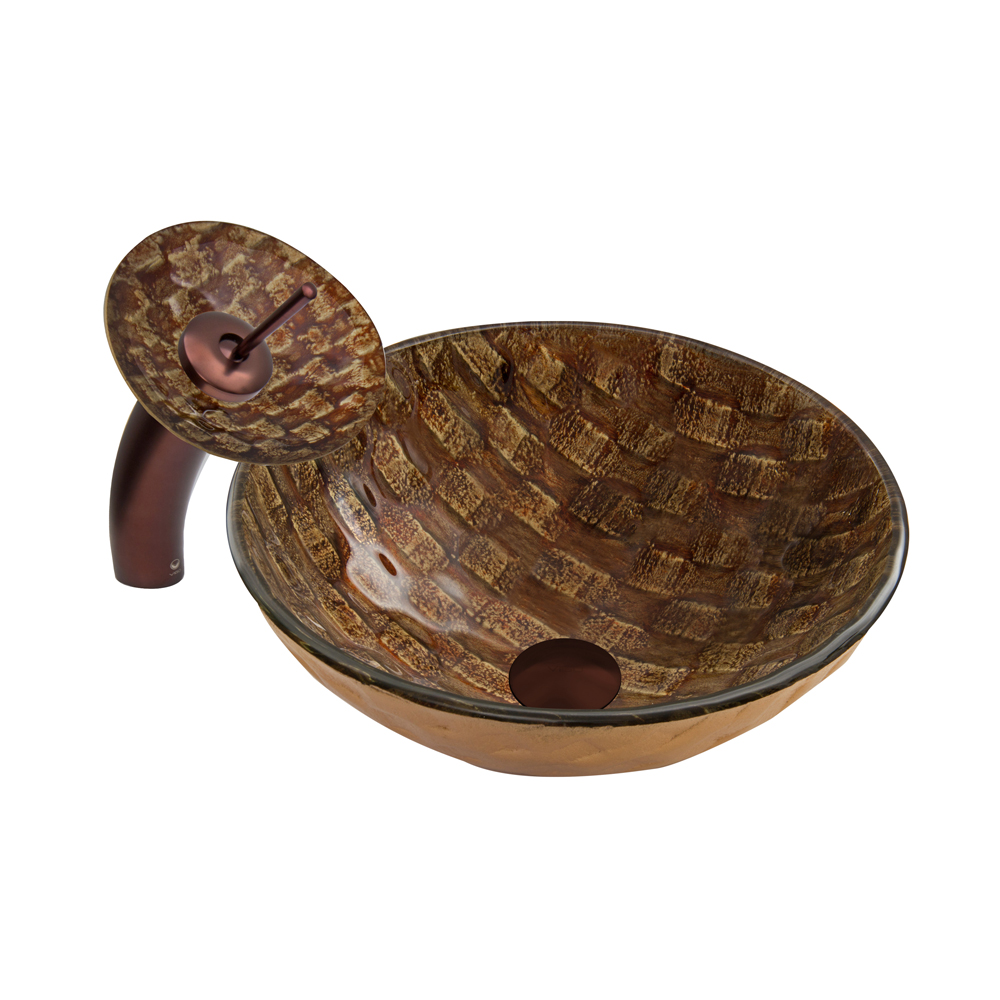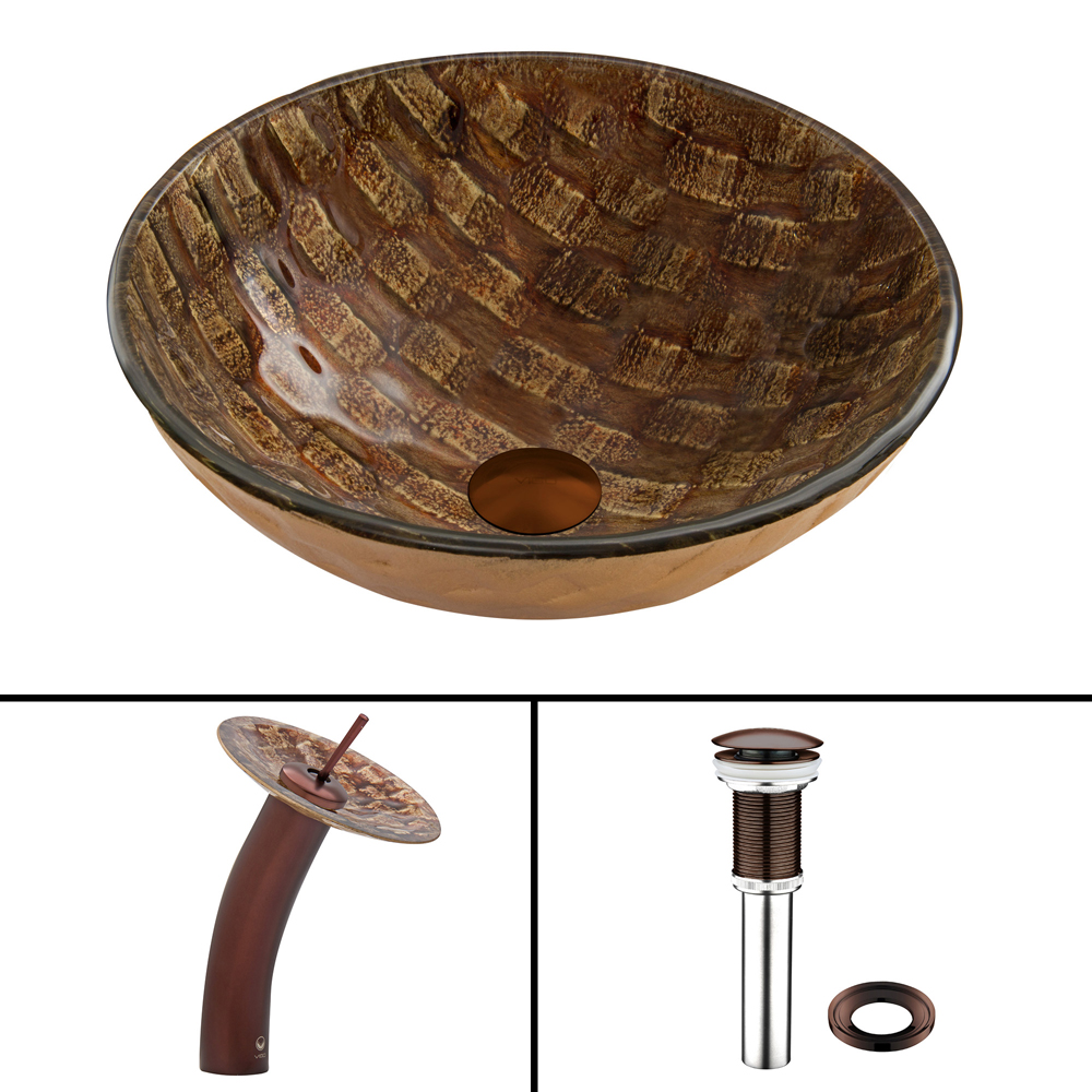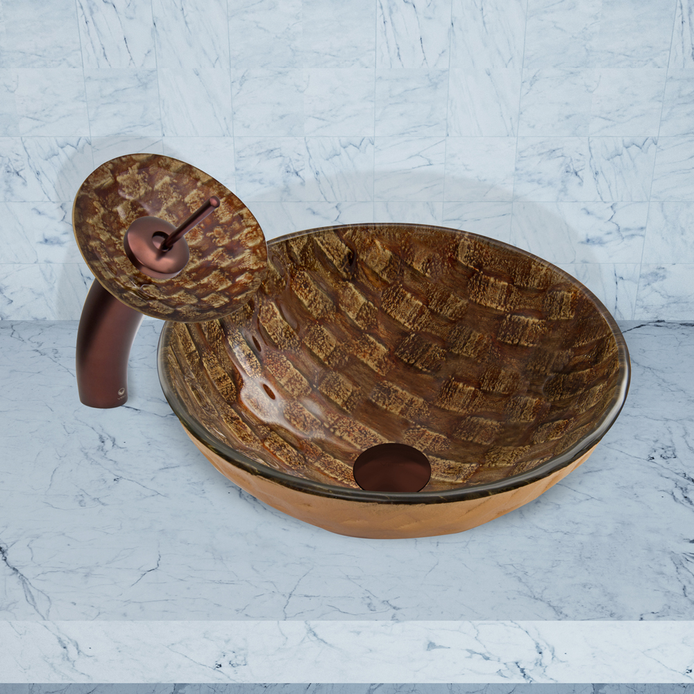 Update your beachy bathroom with the VIGO Playa vessel sink and matching waterfall faucet in oil rubbed bronze. The sand colored weave pattern is an eye-catching design for your bathroom.