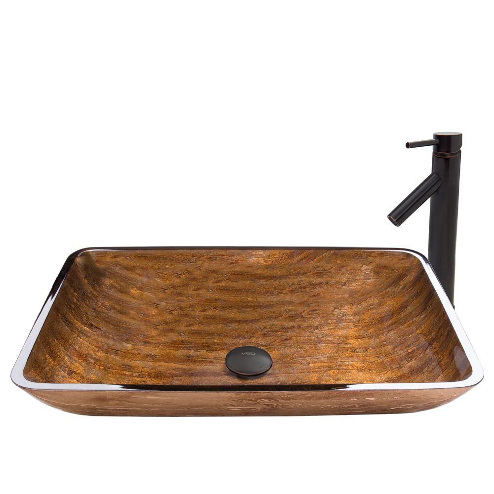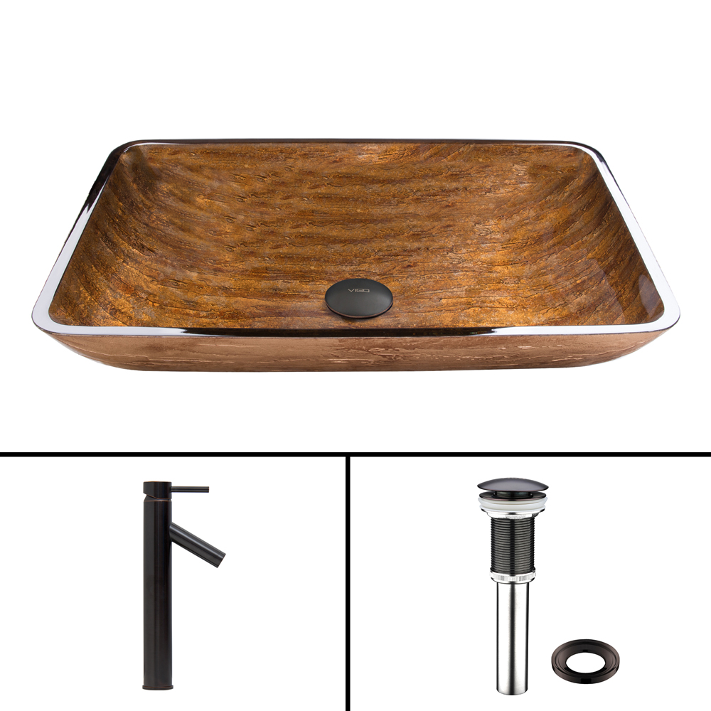 The VIGO Rectangular Amber Sunset Glass Vessel Sink and Dior Faucet Set in Antique Rubbed Bronze Finish will create a warm and inviting ambience in your bathroom.