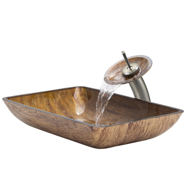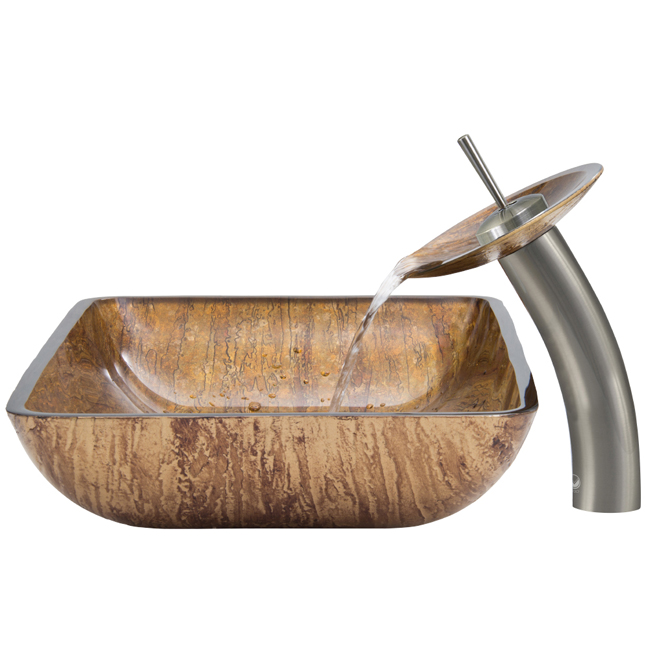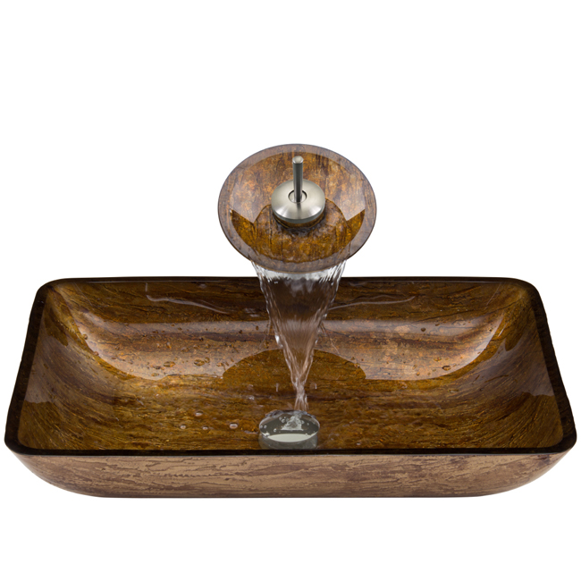 The VIGO Rectangular Amber Sunset glass vessel sink and matching waterfall faucet set will bring the warm hues of a sunset into your home.