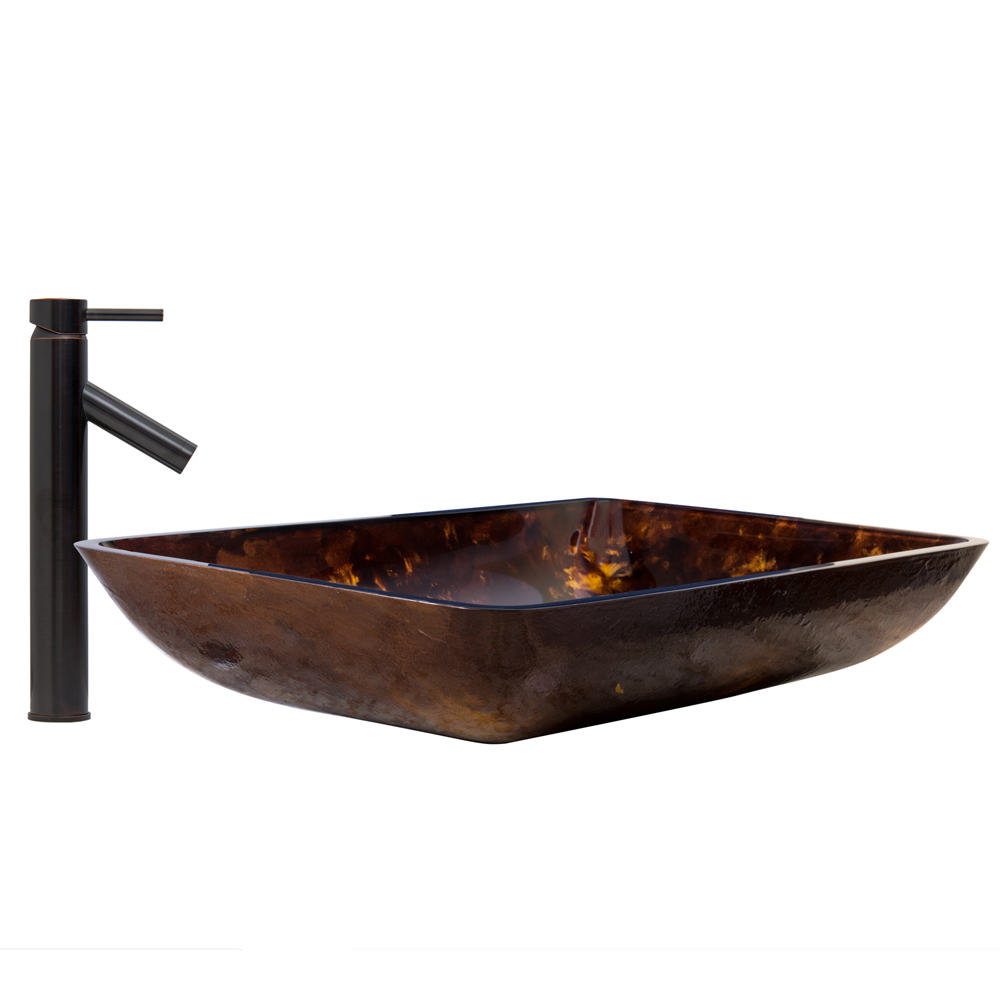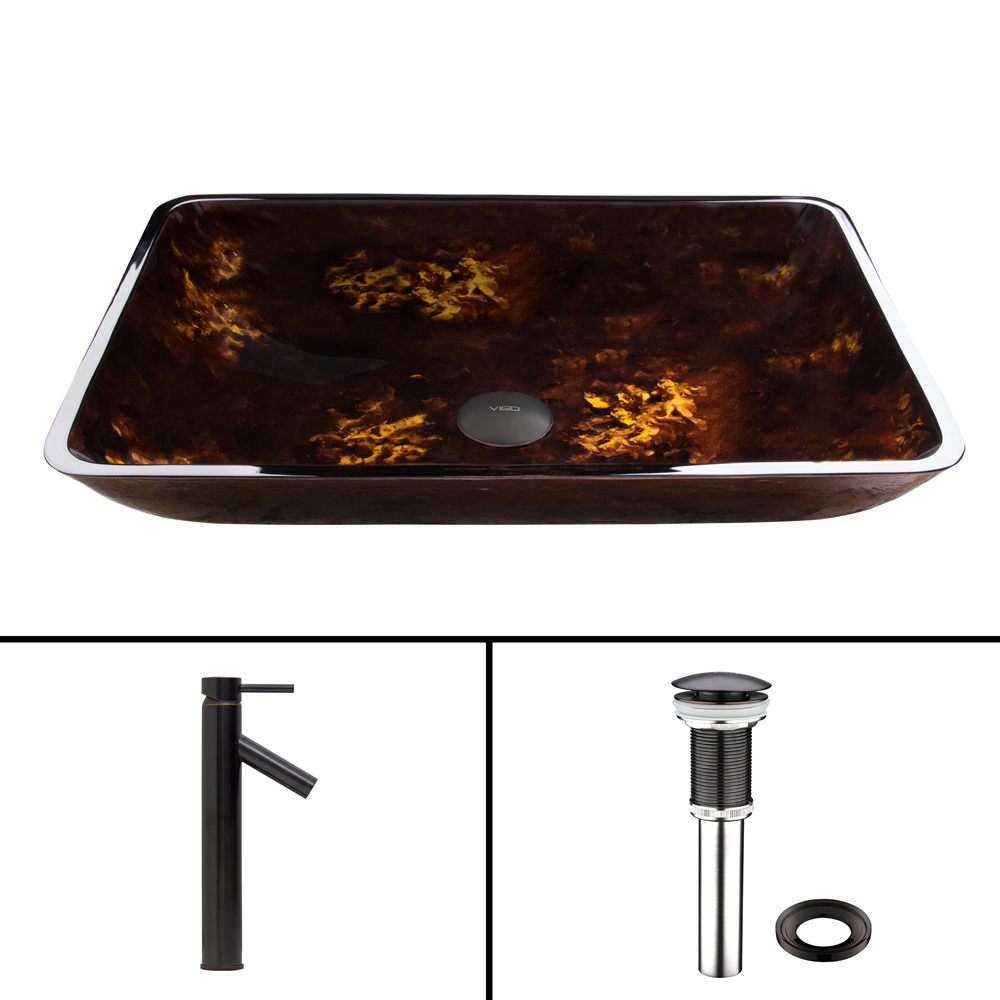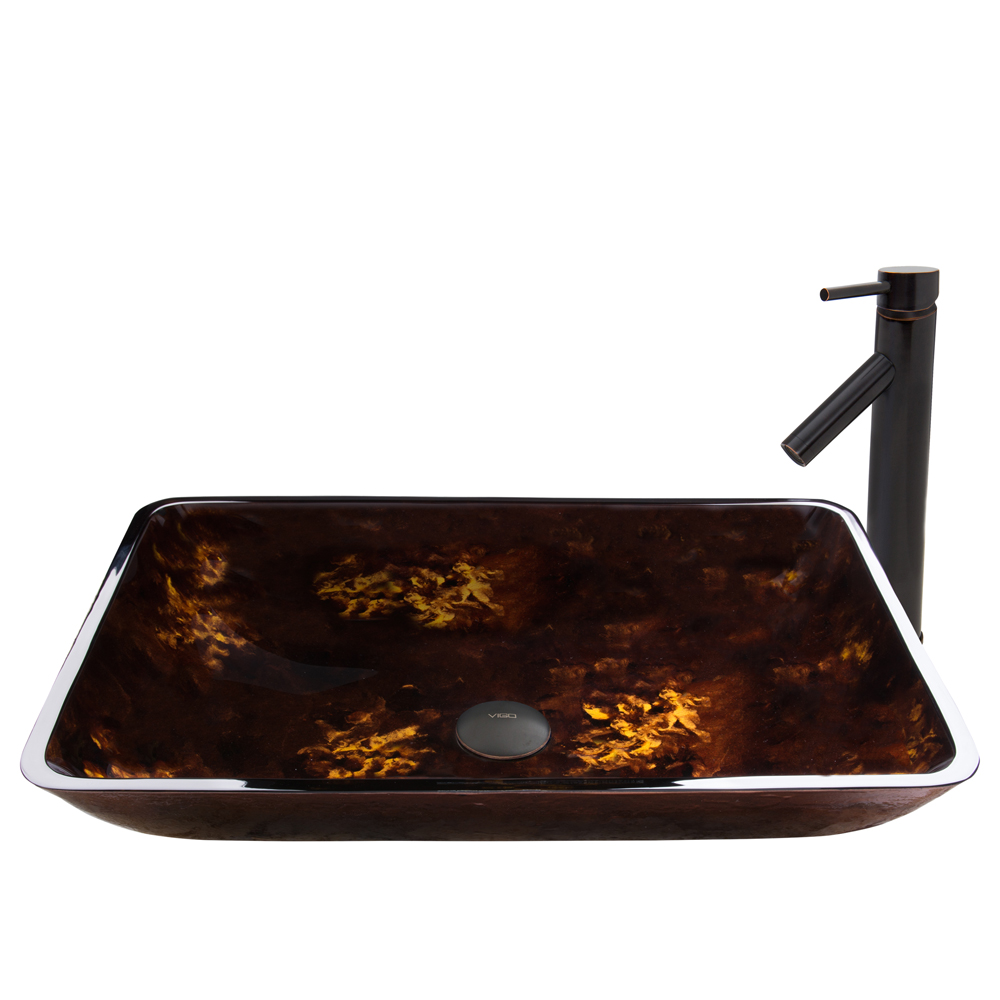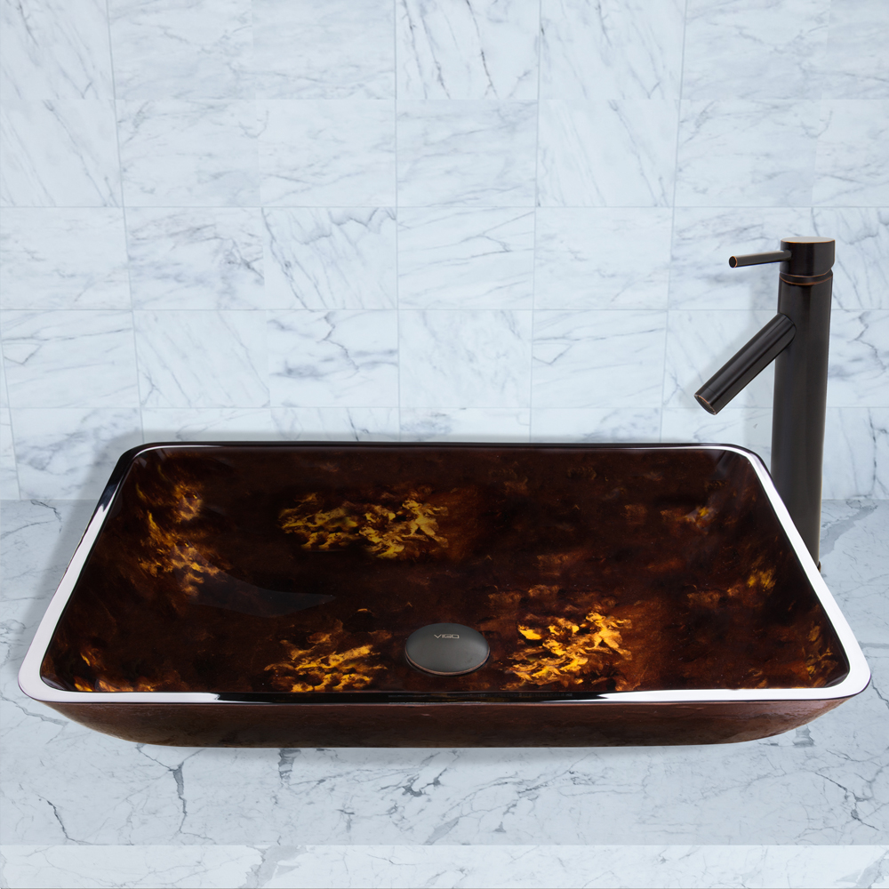 The VIGO Rectangular Brown and Gold Fusion Glass Vessel Sink and Dior Faucet Set in Antique Rubbed Bronze Finish adds that extra bit of pizzazz to your bathroom.