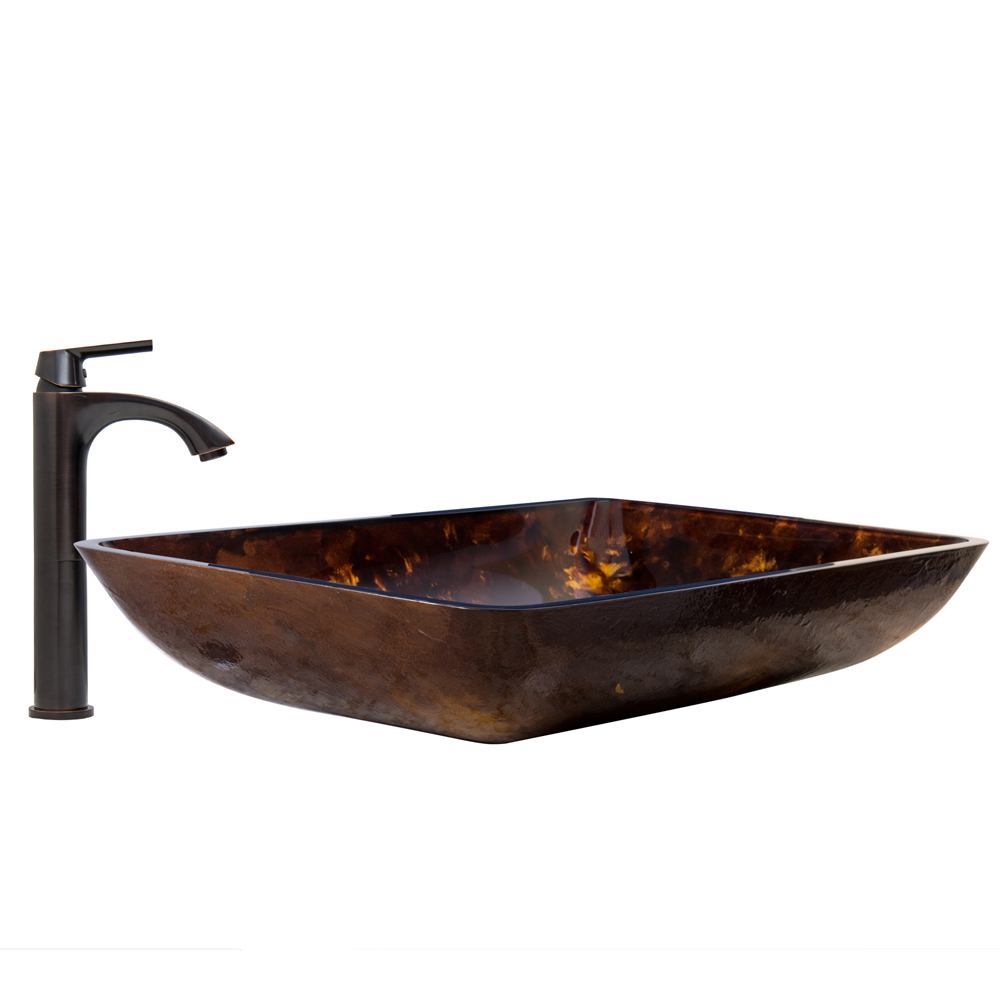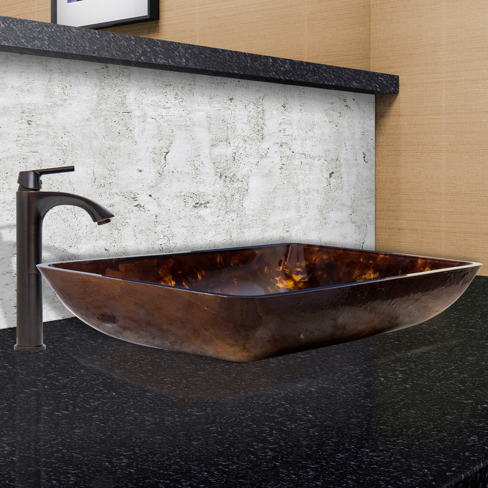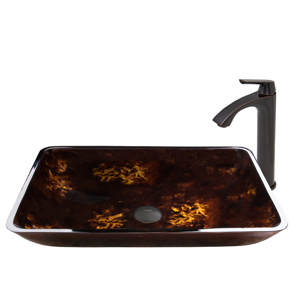 The VIGO Rectangular Brown and Gold Fusion Glass Vessel Sink and Linus Faucet Set in Antique Rubbed Bronze Finish adds that extra bit of pizzazz to your bathroom.
