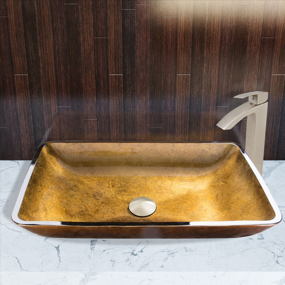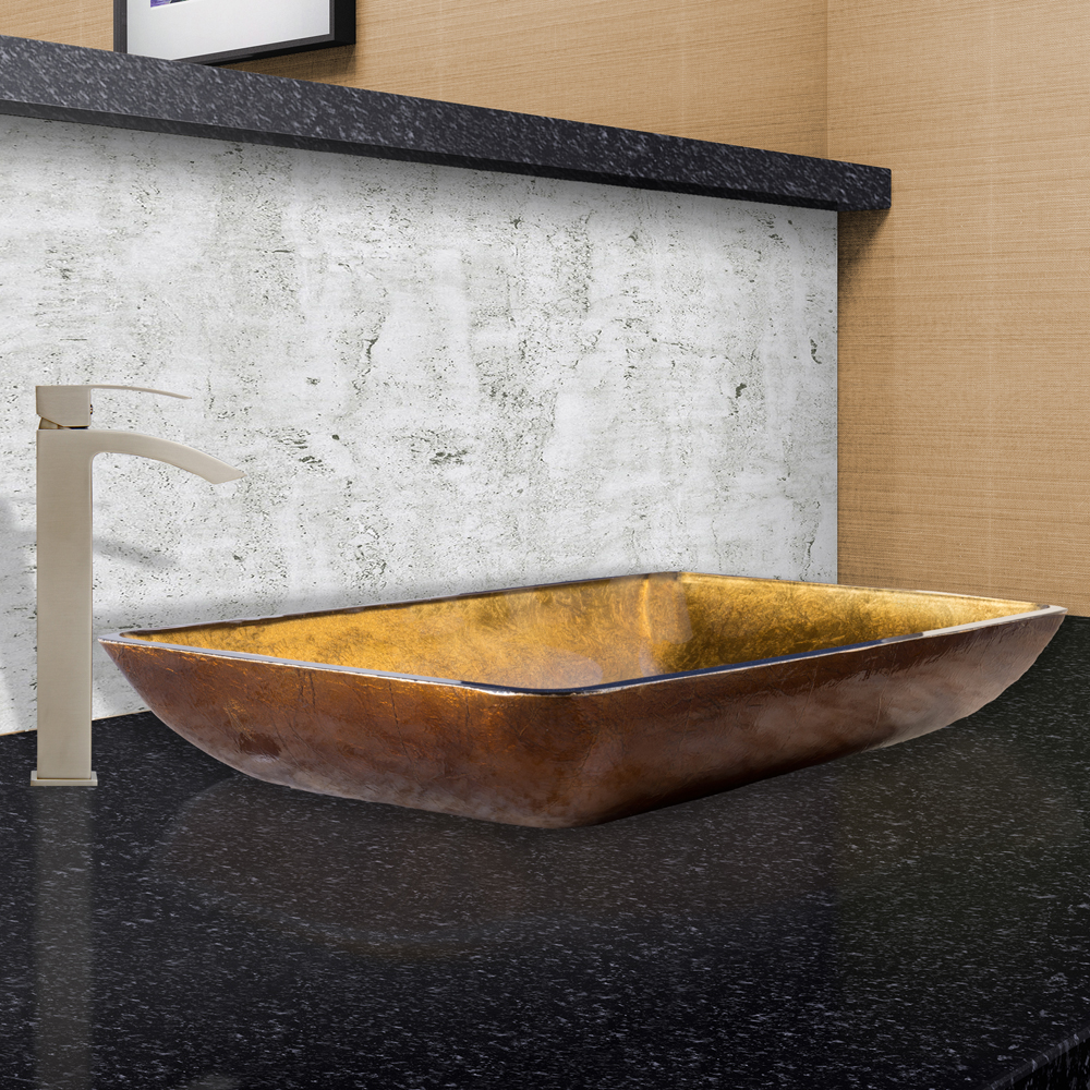The VIGO Rectangular Copper Glass Vessel Sink and Duris Faucet Set in Brushed Nickel Finish will bring a unique and stylish look to your bathroom.
