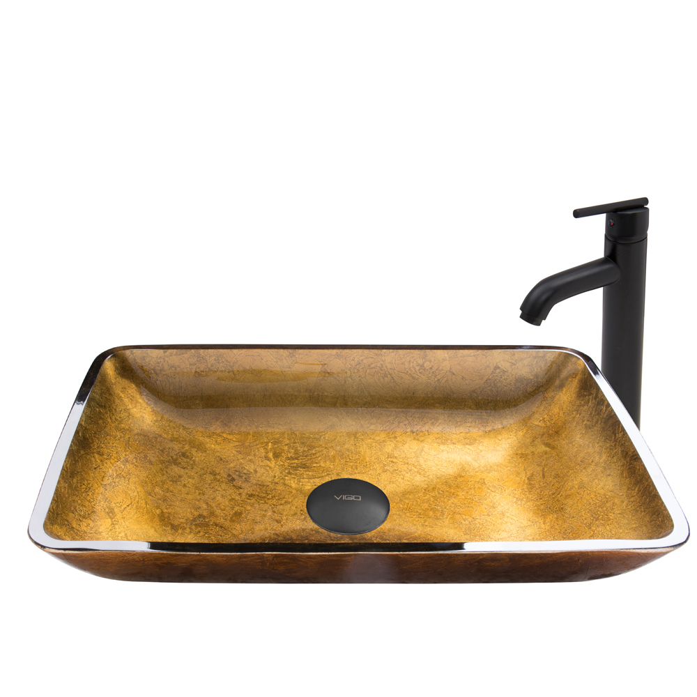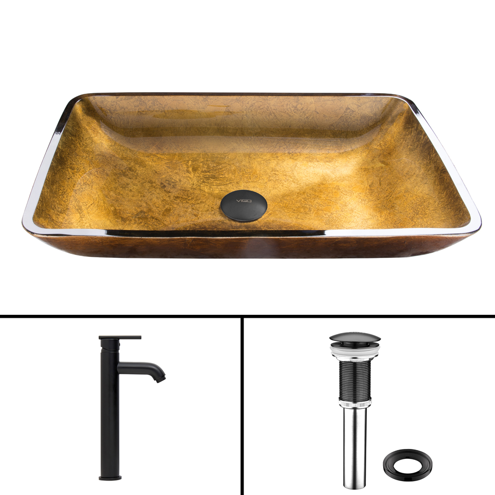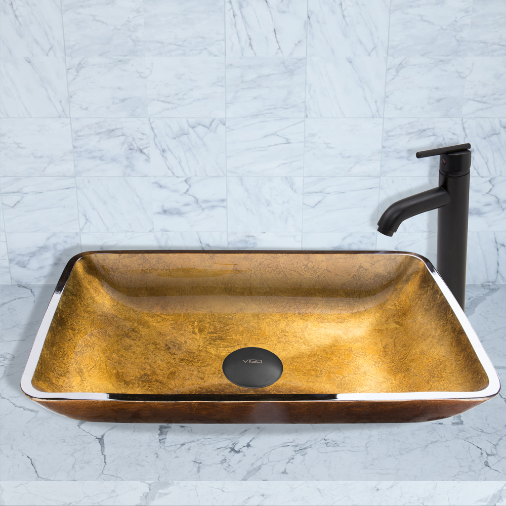 The VIGO Rectangular Copper Glass Vessel Sink and Seville Faucet Set in Matte Black Finish will bring a unique and stylish look to your bathroom.