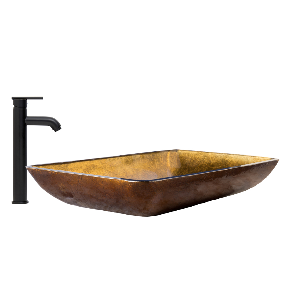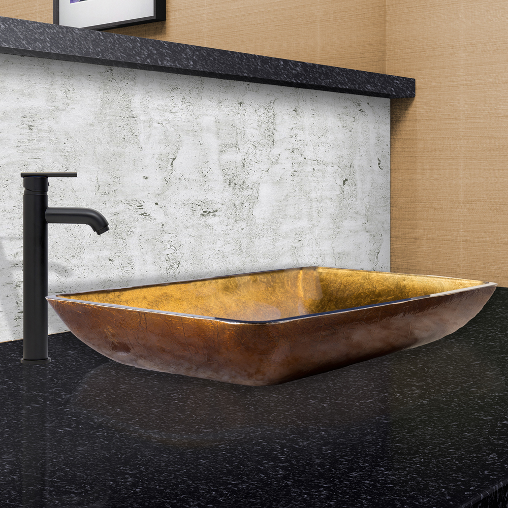 The VG07506 Rectangular Copper glass vessel bowl features a radiant and glowing blend of gold and copper colors,