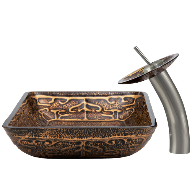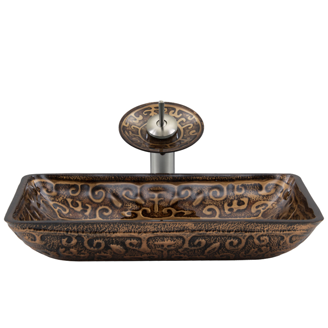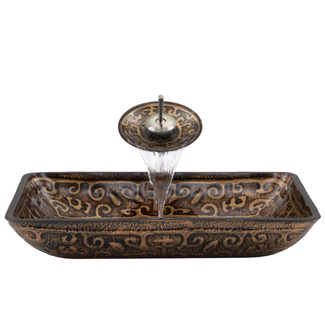 The VIGO Rectangular Golden Greek glass vessel sink and waterfall faucet set is like an ancient masterpiece coveted by all.