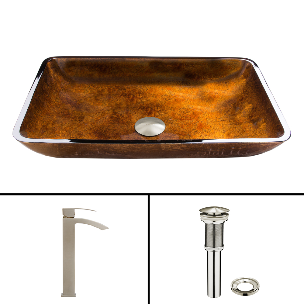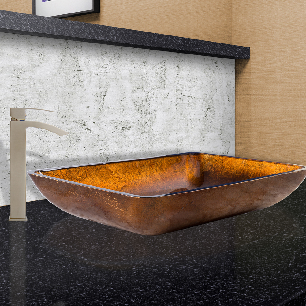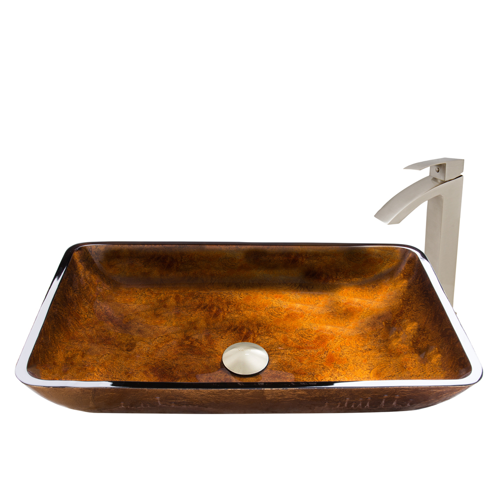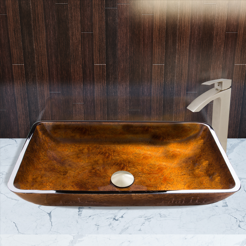 The VIGO Rectangular Russet Glass Vessel Sink and Duris Faucet Set in Brushed Nickel Finish will make your bathroom the highlight of your entire house.