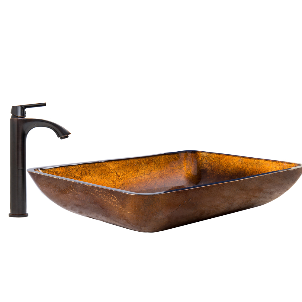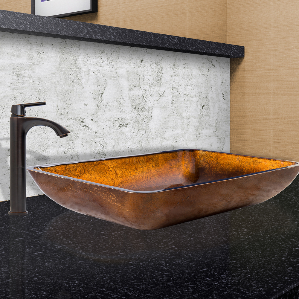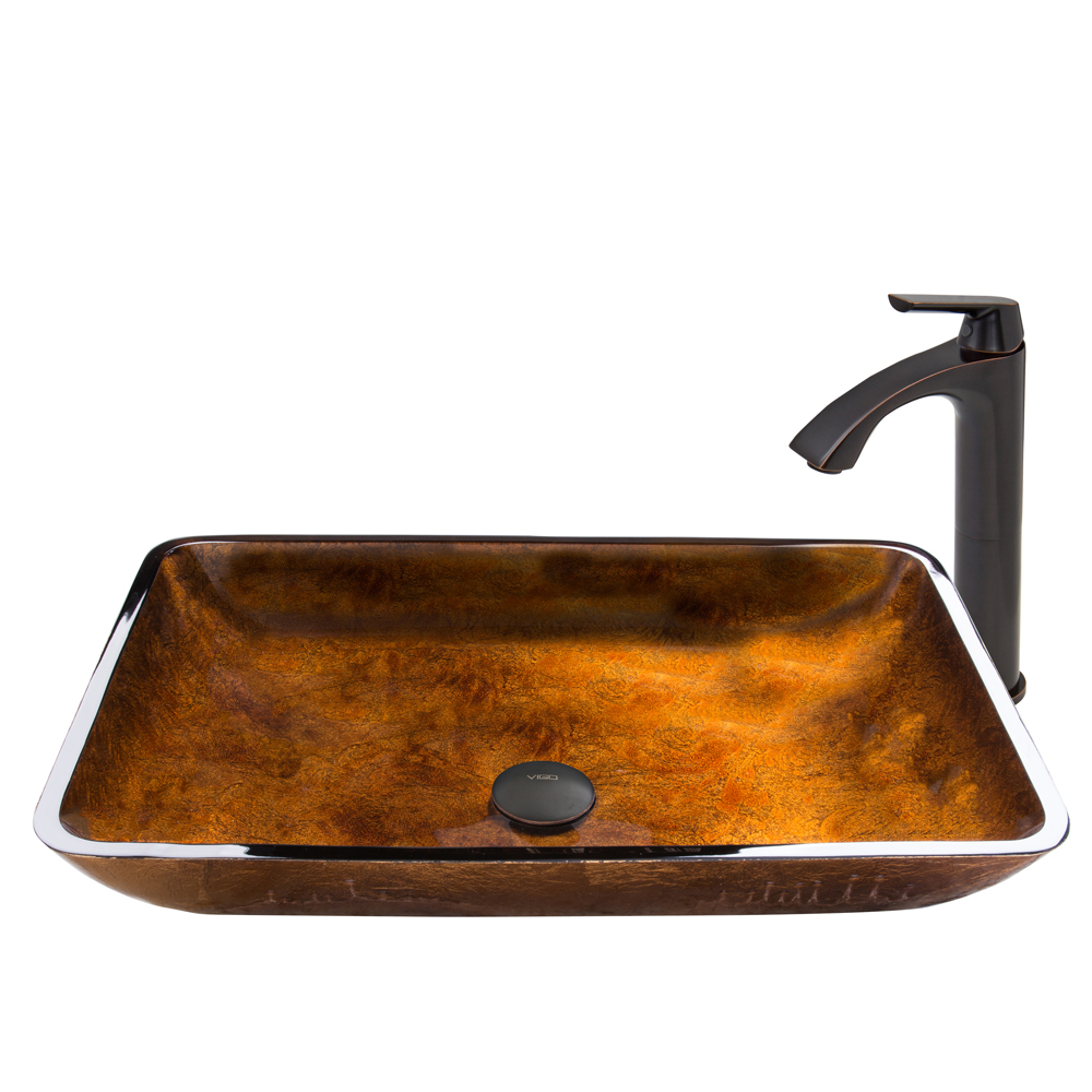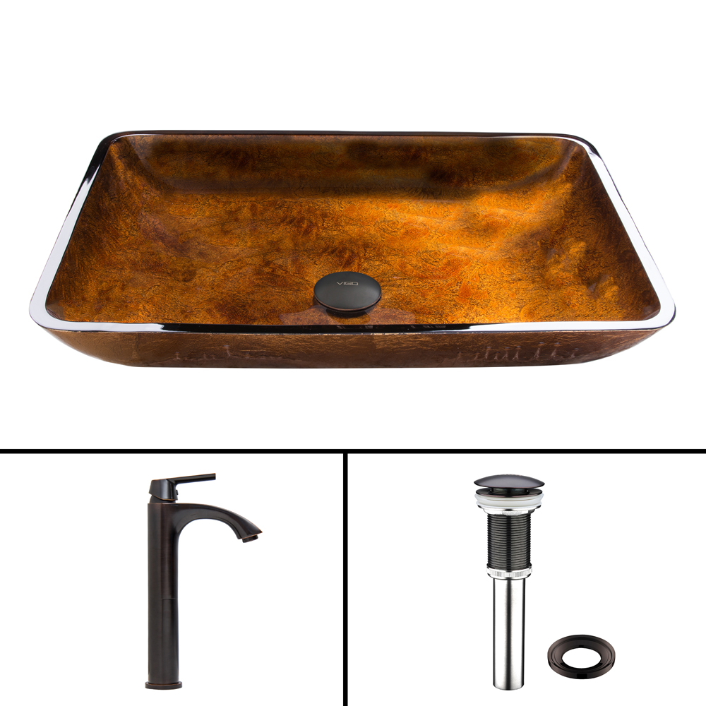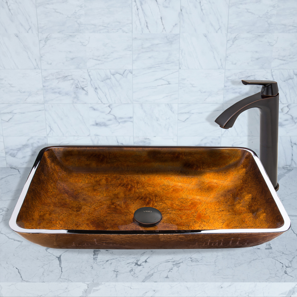 The VIGO Rectangular Russet Glass Vessel Sink and Linus Faucet Set in Antique Rubbed Bronze Finish will make your bathroom the highlight of your entire house.
