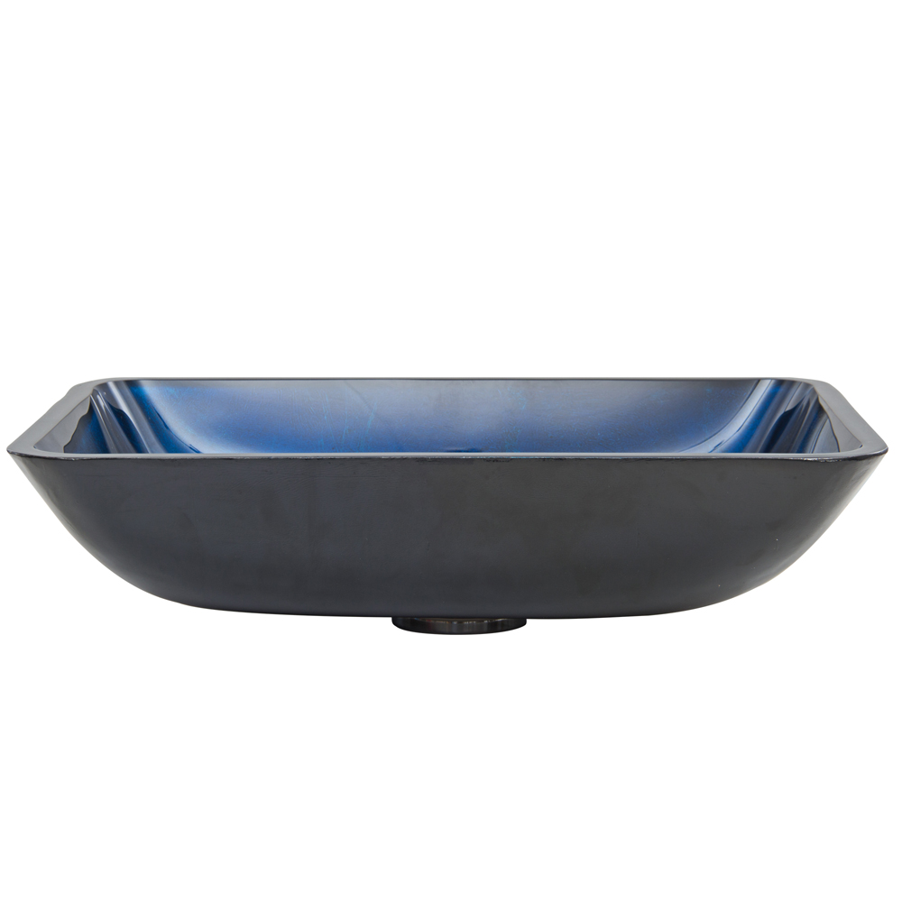 The VG07068 Rectangular Turquois Water glass vessel sink features an ombre style of sapphire blue colors, resembling the deep waters of the Caribbean.